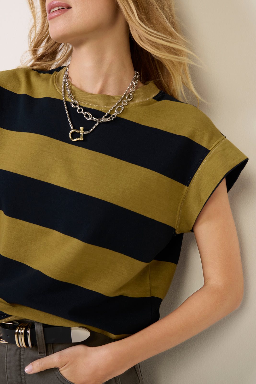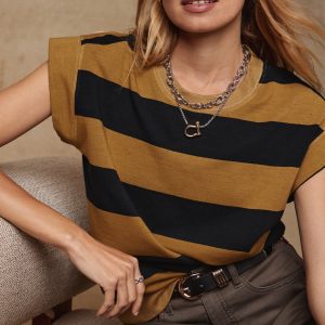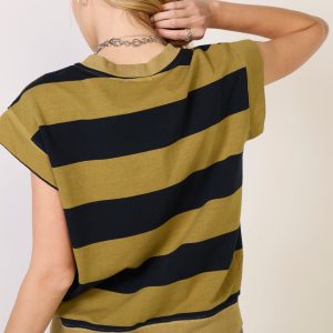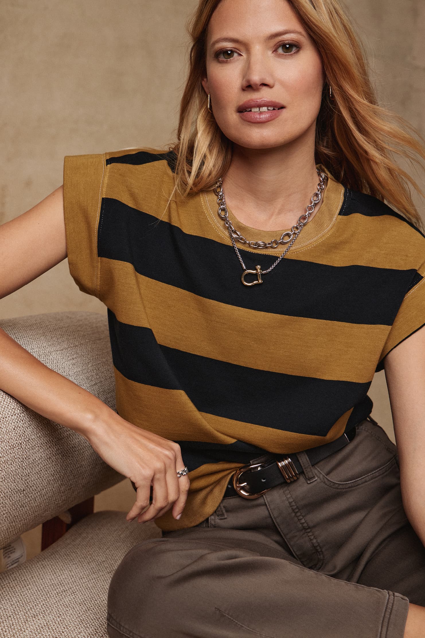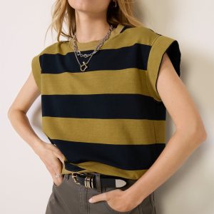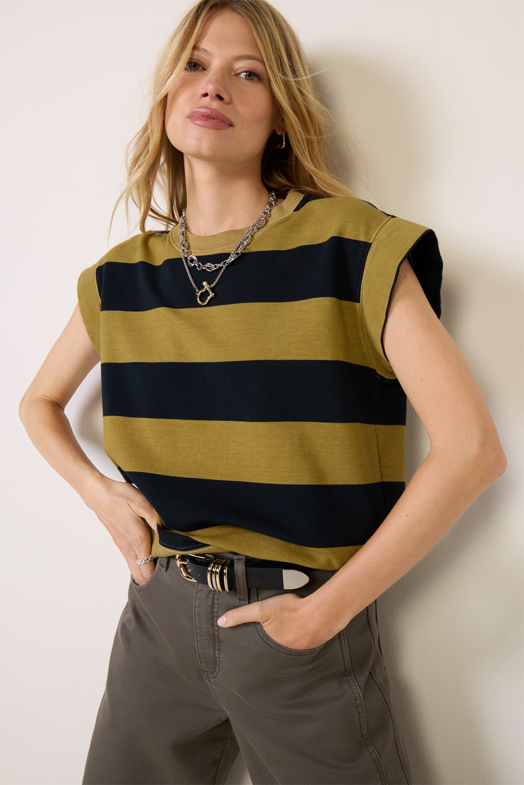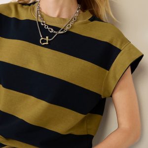 Perfect for everyday wear, this striped sweatshirt by EVEREVE features a crewneck silhouette with cap sleeves and a banded hem.