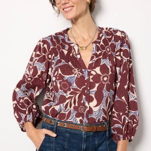 Add a pop of print to your wardrobe with theHaddon Top by Velvet. This button-front blouse is crafted in lightweight cotton cambric with a round collar, smocked front yoke, and three-quarter puff sleeves.