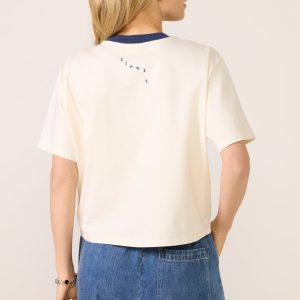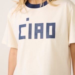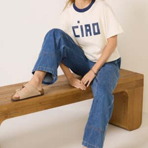 Finished in comfortable cotton, this graphic tee by Clare V. will be your go-to for weekend wear,featuring a boxy, cropped silhouette with a contrasting collar, short sleeves, and “Ciao” block lettering across the front.
