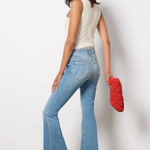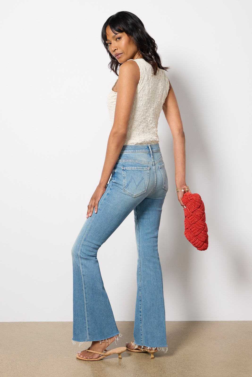 Finished with full-length raw hems, the Weekender Fray flare jean by MOTHER is crafted in soft stretch denimwith a flattering mid-rise waist and faded light blue wash.