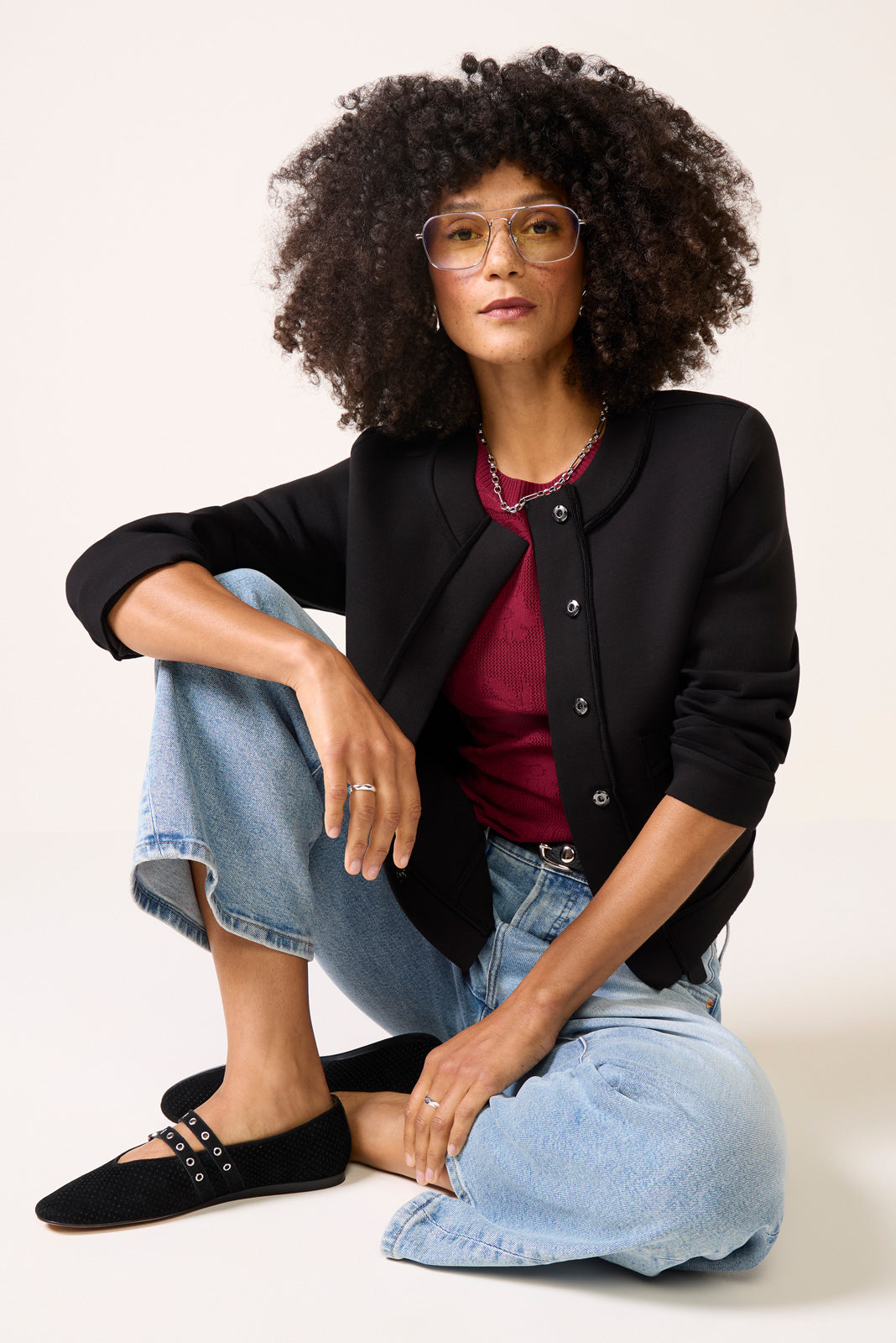 Finished in a sleek scuba knit fabric, this jacket by EVEREVE features front snap closures, patch pockets, reverse seam detailing, and a cropped silhouette.