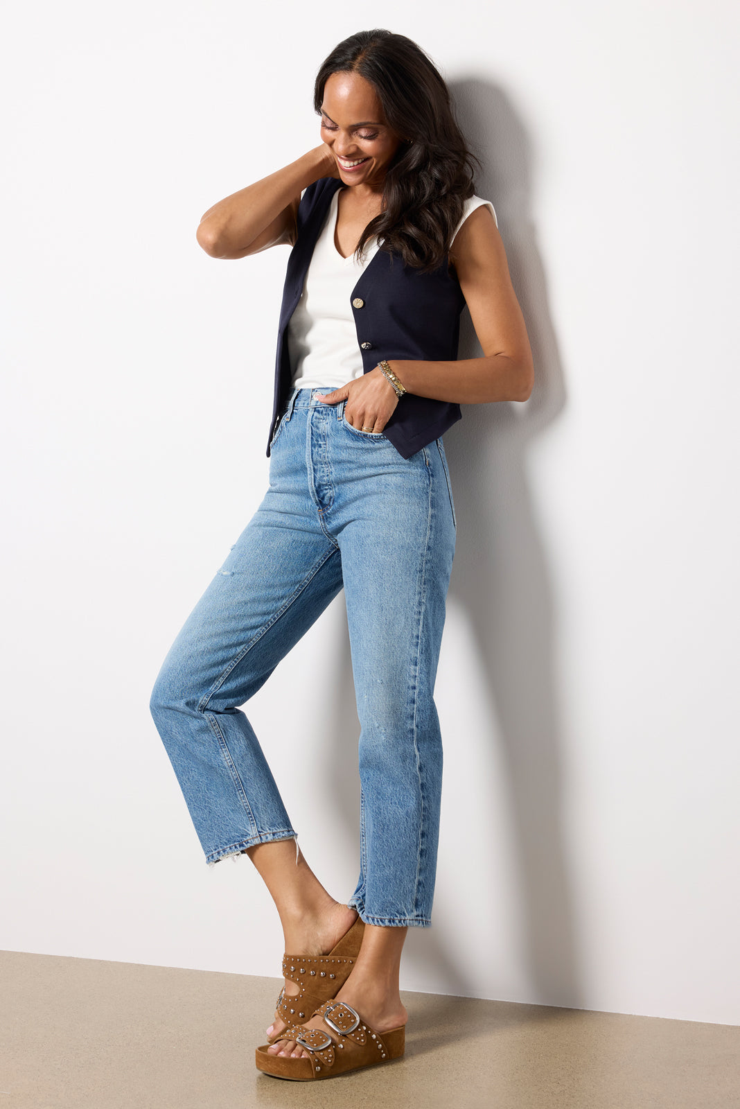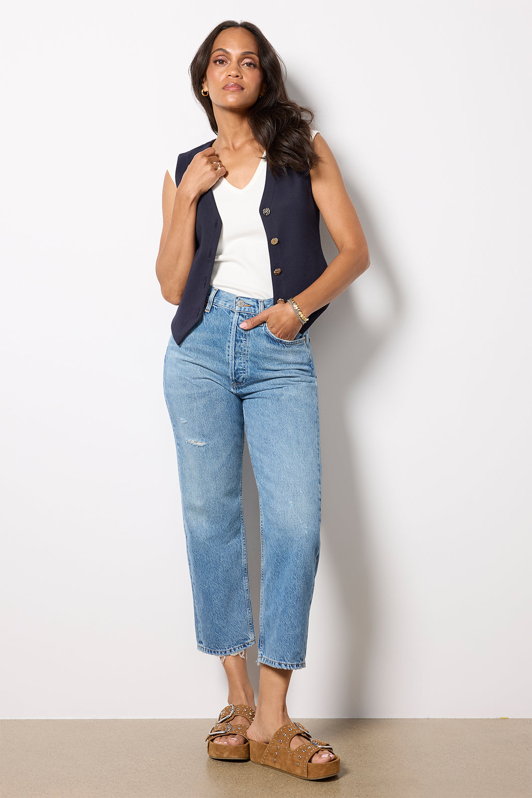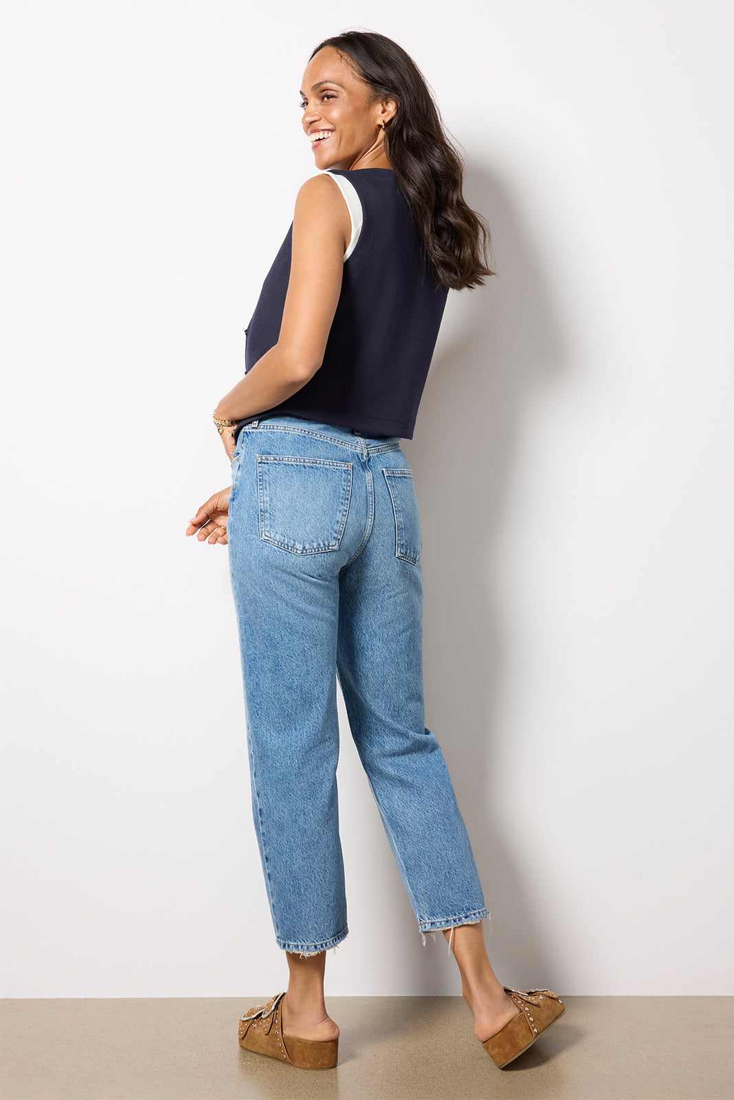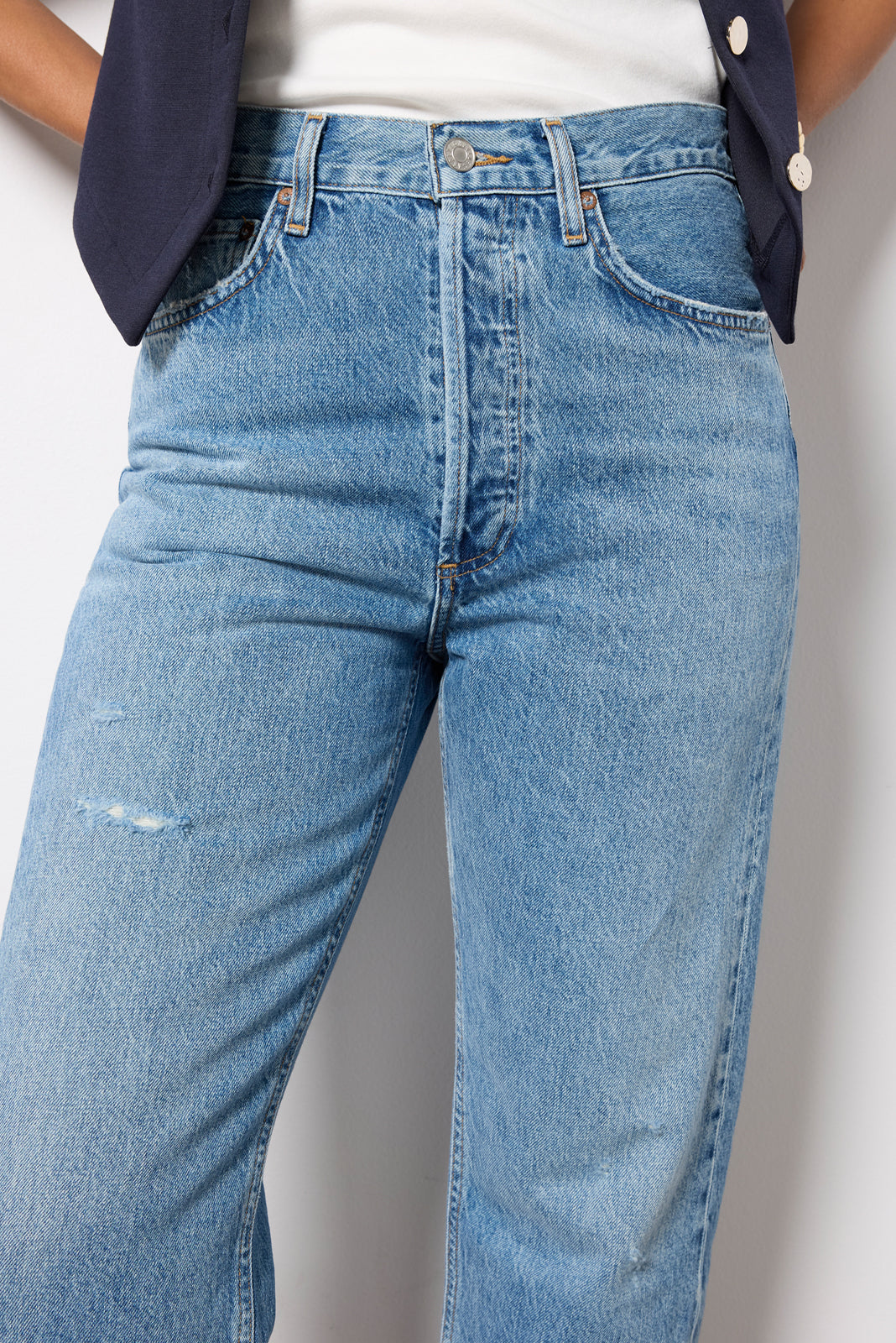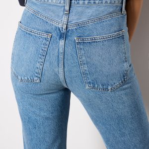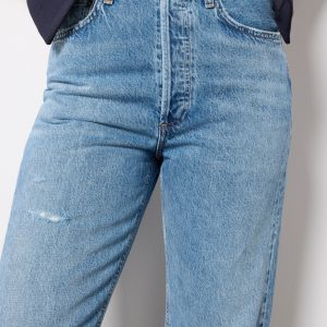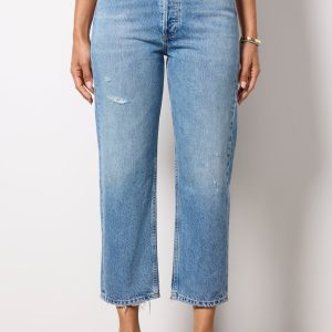 Designed with a 90s-inspired fit, these straight leg jeans by AGOLDE are crafted insoft, non-stretch cotton denim and feature a high-rise waist, cropped length, and a hint of distressing for a lived-in feel.