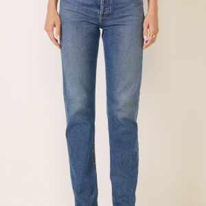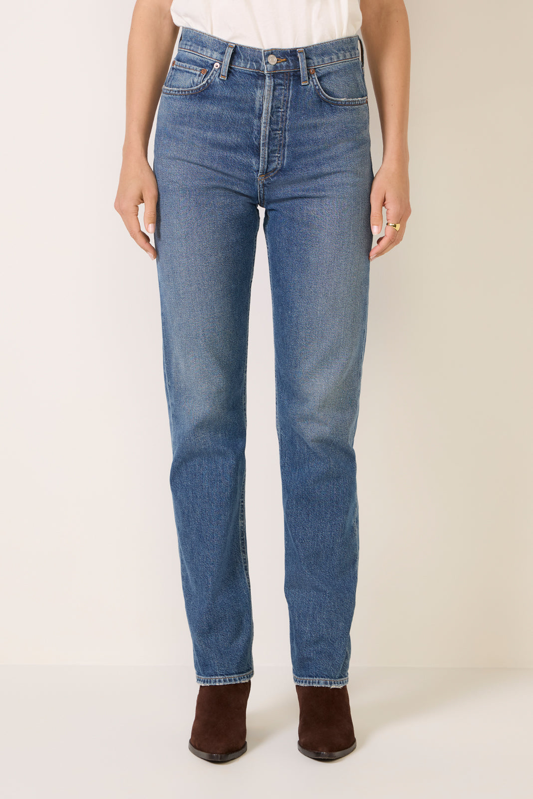 Crafted from soft, sustainable cotton denim with a hint of stretch, the 90s Pinch Waist jean by AGOLDE features a classic straight leg silhouette with a high-rise waist and a 27 1/2″ inseam.