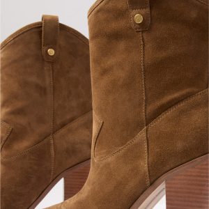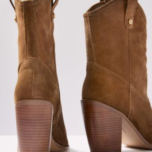 Kick off the season in style withthe Abel WesternBootie by Vince Camuto. These pull-on boots are crafted in soft brown suede and feature a stacked block heel, Western-style stitching, and a pointed toe with a gold metal detail.