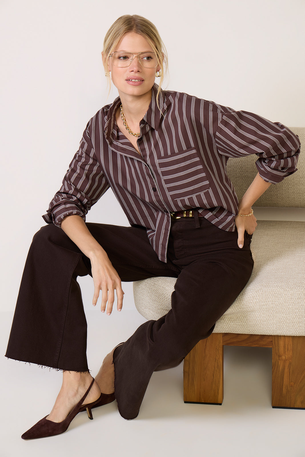 Crafted in striped cotton fabric, this button-down shirt by EVEREVE is perfect for work-to-weekend wear, featuringlong sleeves with button tabs, a left chest pocket, and a cropped silhouette for a chic, modern feel.