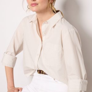 Crafted in striped cotton fabric, this button-down shirt by EVEREVE is perfect for work-to-weekend wear, featuringlong sleeves with button tabs, a left chest pocket, and a cropped silhouette for a chic, modern feel.