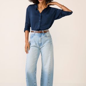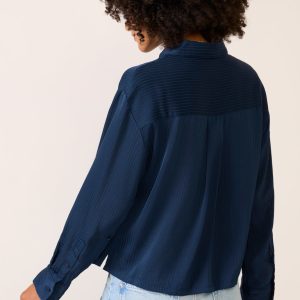 Crafted in subtly striped satin, the Aiden button-down shirt by EVEREVE is perfect for work-to-weekend wear, featuring a cropped silhouette, left chest pocket, and long sleeves.
