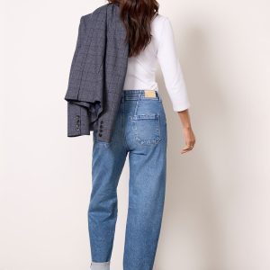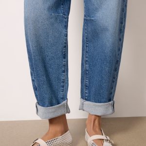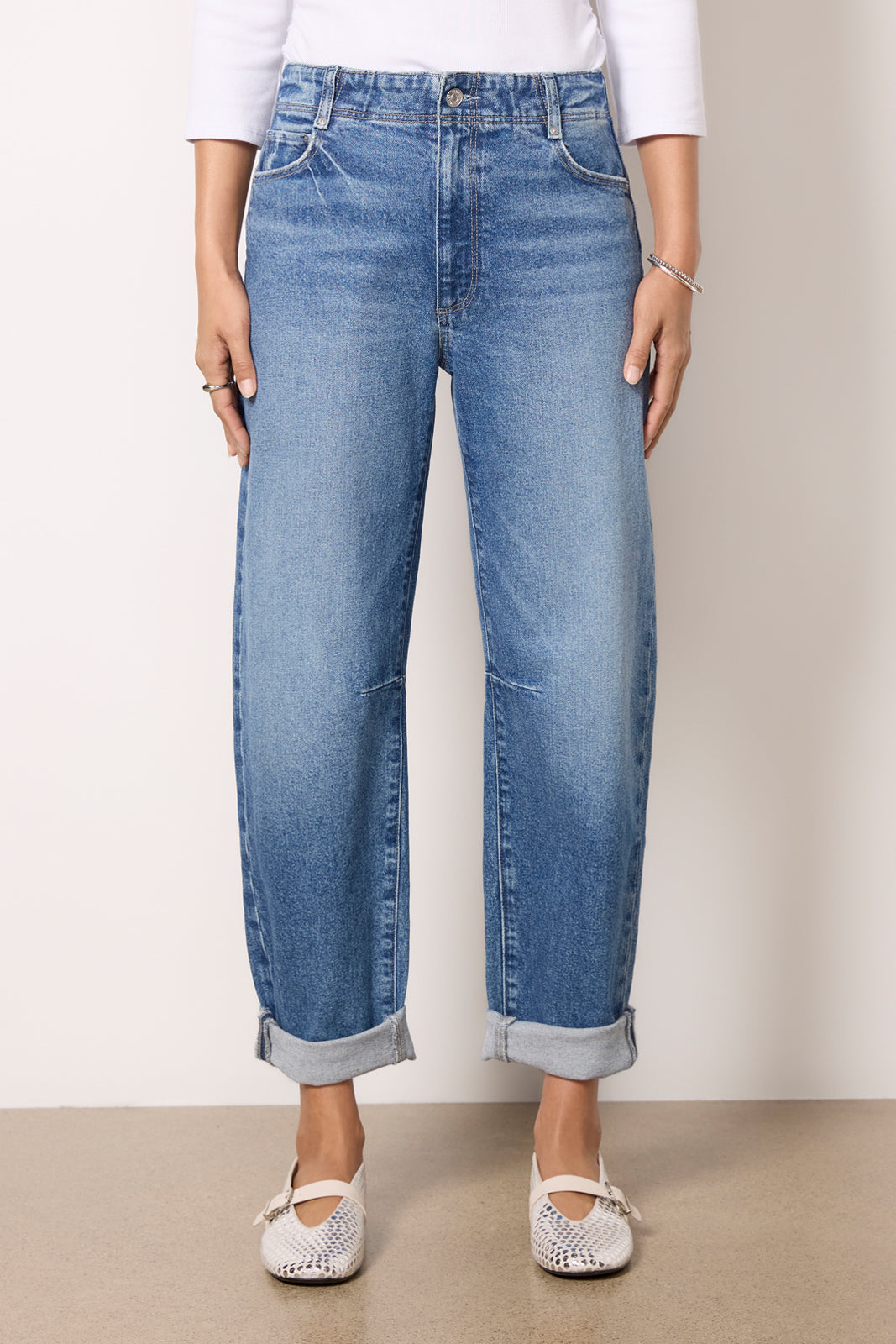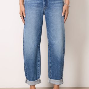 Finished with rolled hems, these stylish barrel jeans by Paige feature a high-rise silhouette, bowed leg, and rigid cotton denim for a vintage feel.