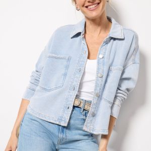 The All Day Cropped Knit Jacket by Z Supply is crafted in a soft cotton blend and features a curved hemline, large front pockets, and a classic shirt collar.
