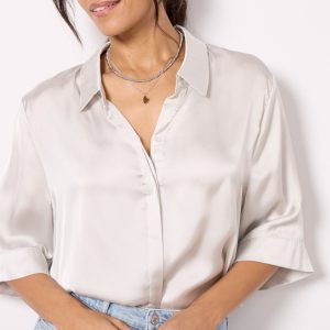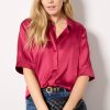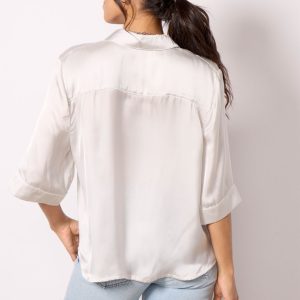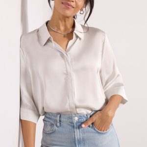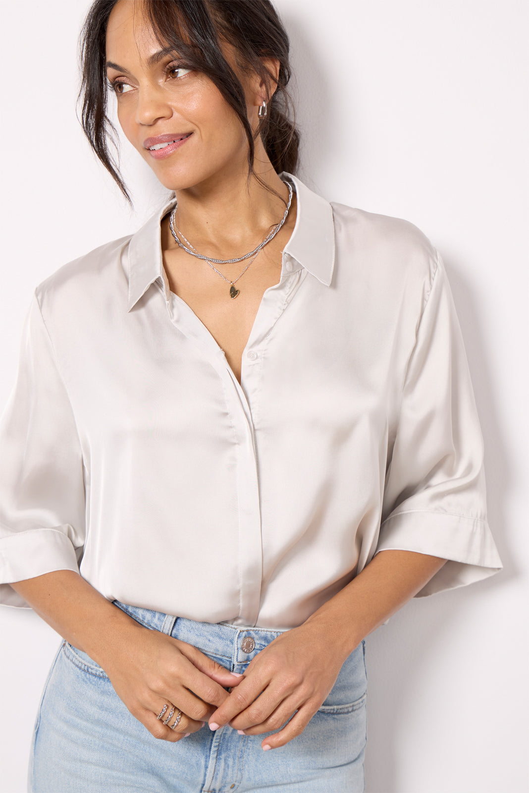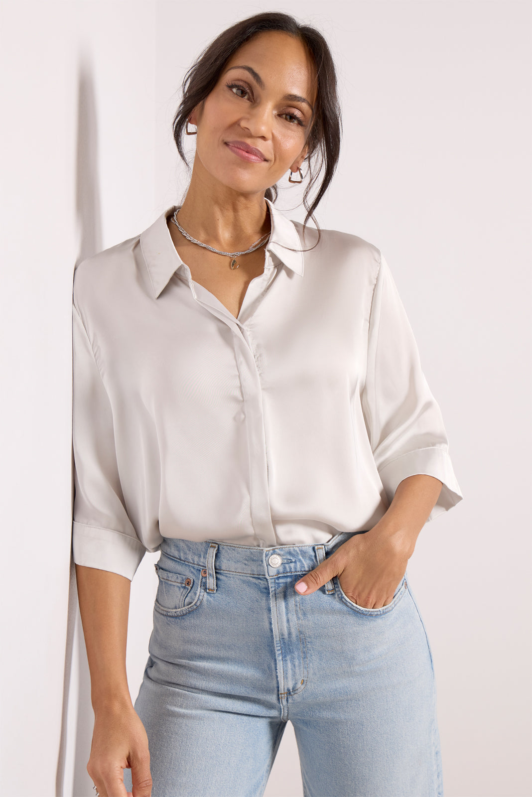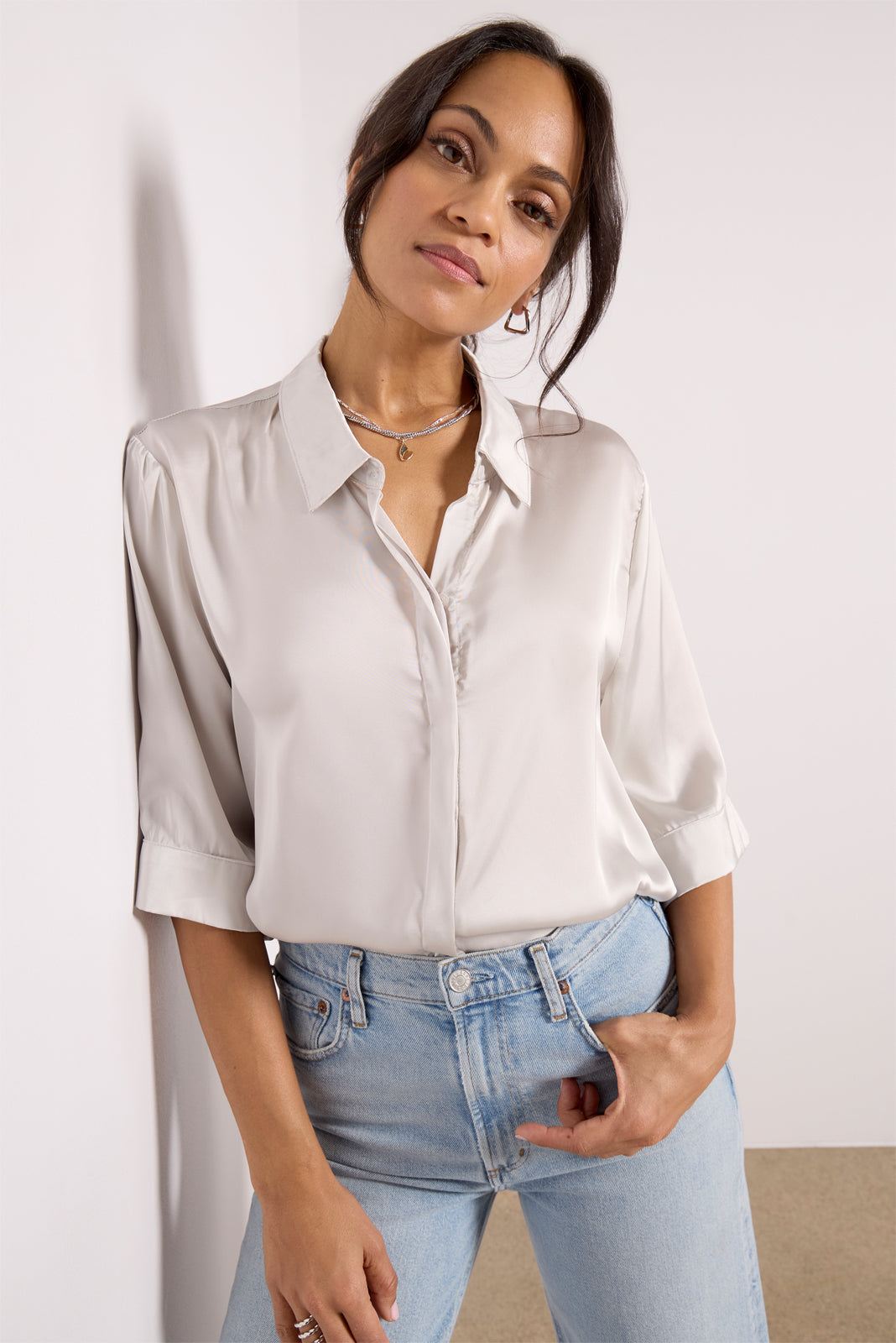 Update your button-down wardrobe with the Aly Satin Shirt by EVEREVE, featuring hidden front button closures, elbow-length sleeves, and gathering details at the shoulder.