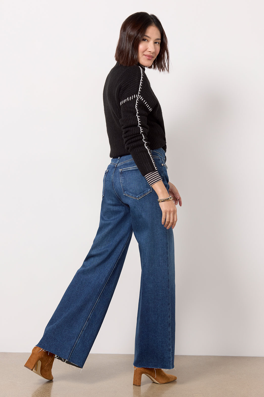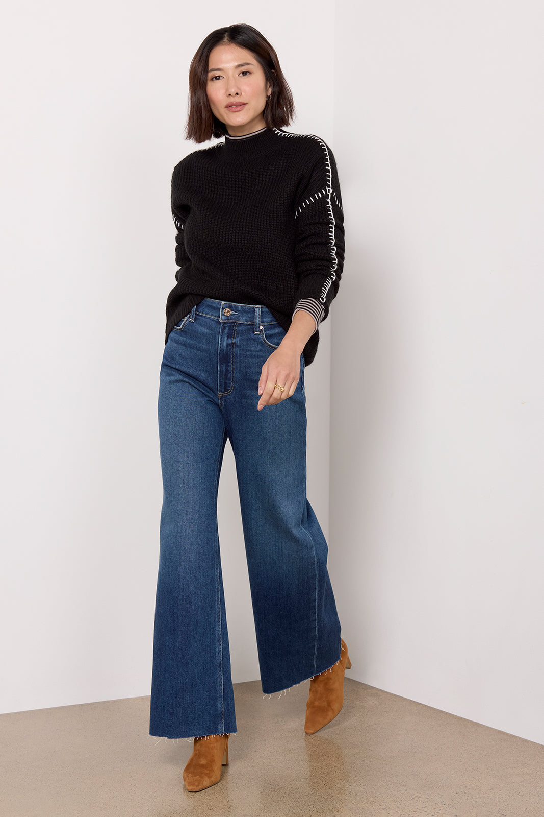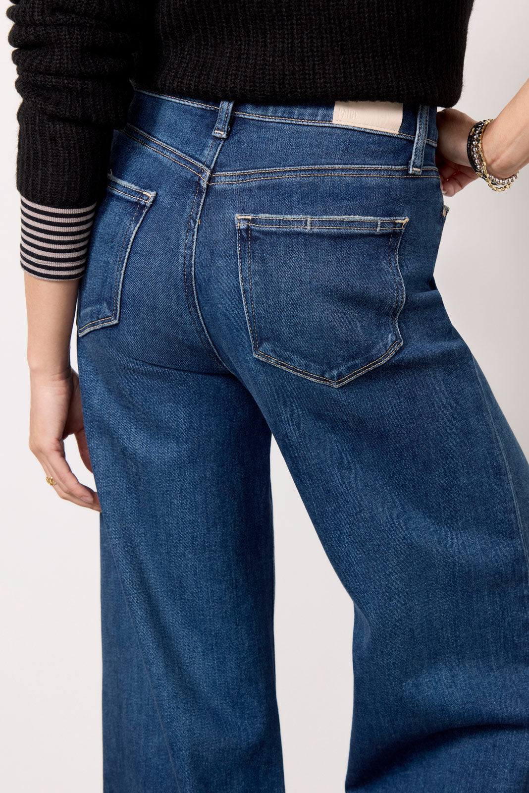 The wide leg jean you’ll be wearing on repeat. Designed with a petite 29″ inseam and higher knee and mid-thigh placements,these Paige jeans are crafted in soft stretch denim with a flattering high-rise fit, dark blue wash, and full-length raw hems. Take them from day to night with the switch of a shoe.
