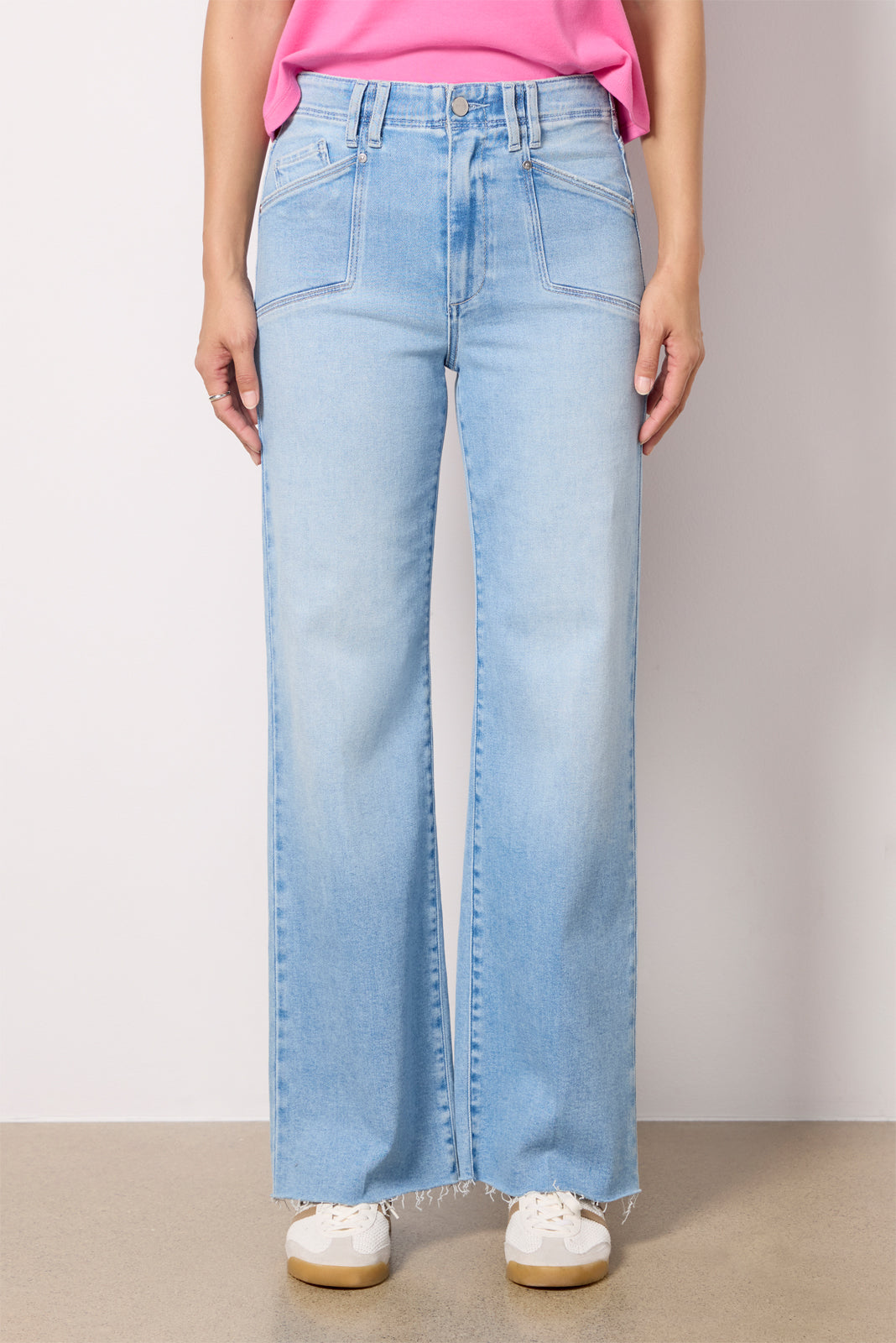 The wide leg jean you’ll be wearing on repeat. Finished with a full-length 31″ inseam and inset front pockets, these Paige jeans are crafted in soft stretch denim with a flattering high-rise fit, light blue wash, and raw hems.