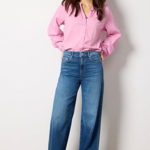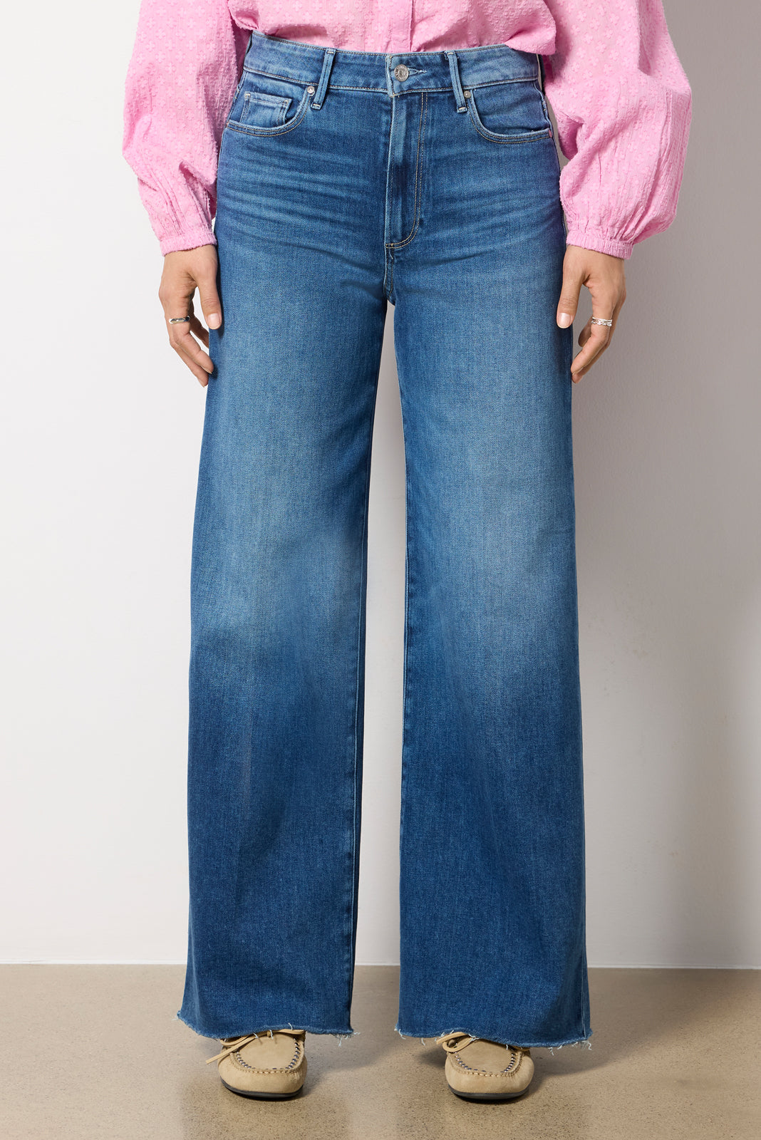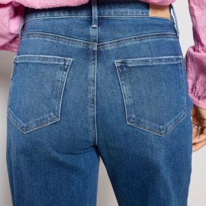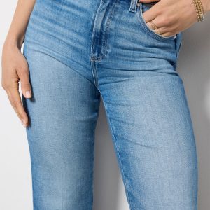 The wide leg jean you’ll be wearing on repeat. Finished with a full-length 31″ inseam, these Paige jeans are crafted in soft stretch denim with a flattering high-rise fit,faded blue wash, and raw hems.