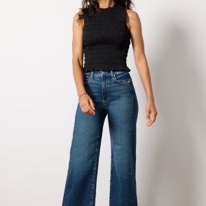The wide-leg jean you’ll be wearing on repeat. Finished with a full-length 31″ inseam, these Paige jeans are crafted in soft stretch denim with a flattering high-rise fit, dark blue wash, and side seam inset details.