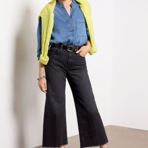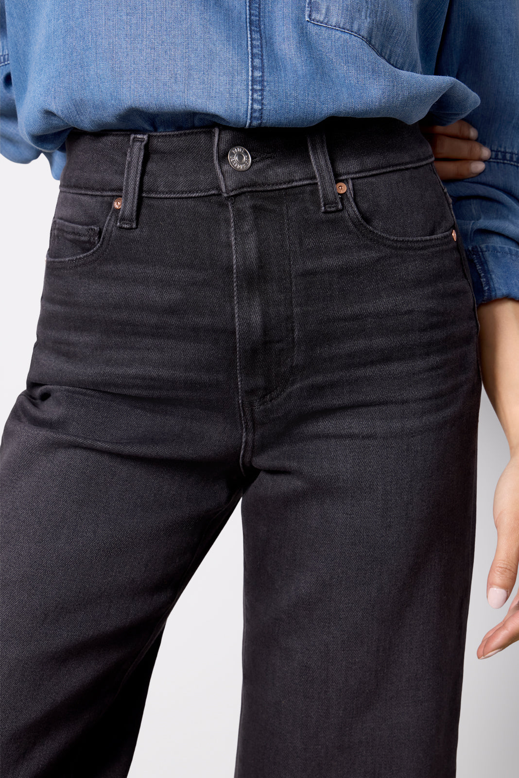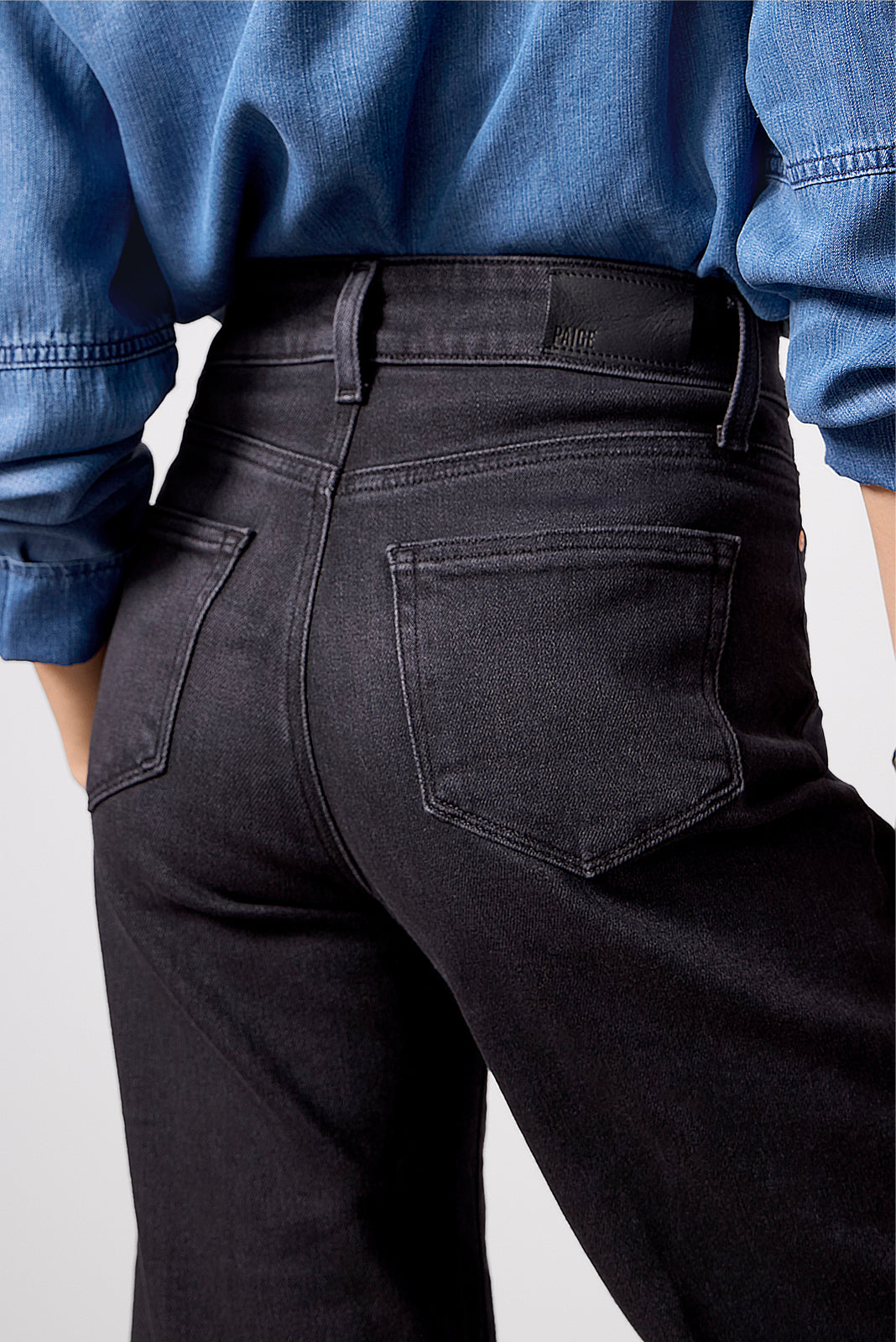 The wide leg jean you’ll be wearing on repeat. Designed with a petite 25″ inseam and higher knee and mid-thigh placements, these Paige jeans are crafted in soft stretch denim with a flattering high-rise fit,black wash, and ankle-length raw hems.