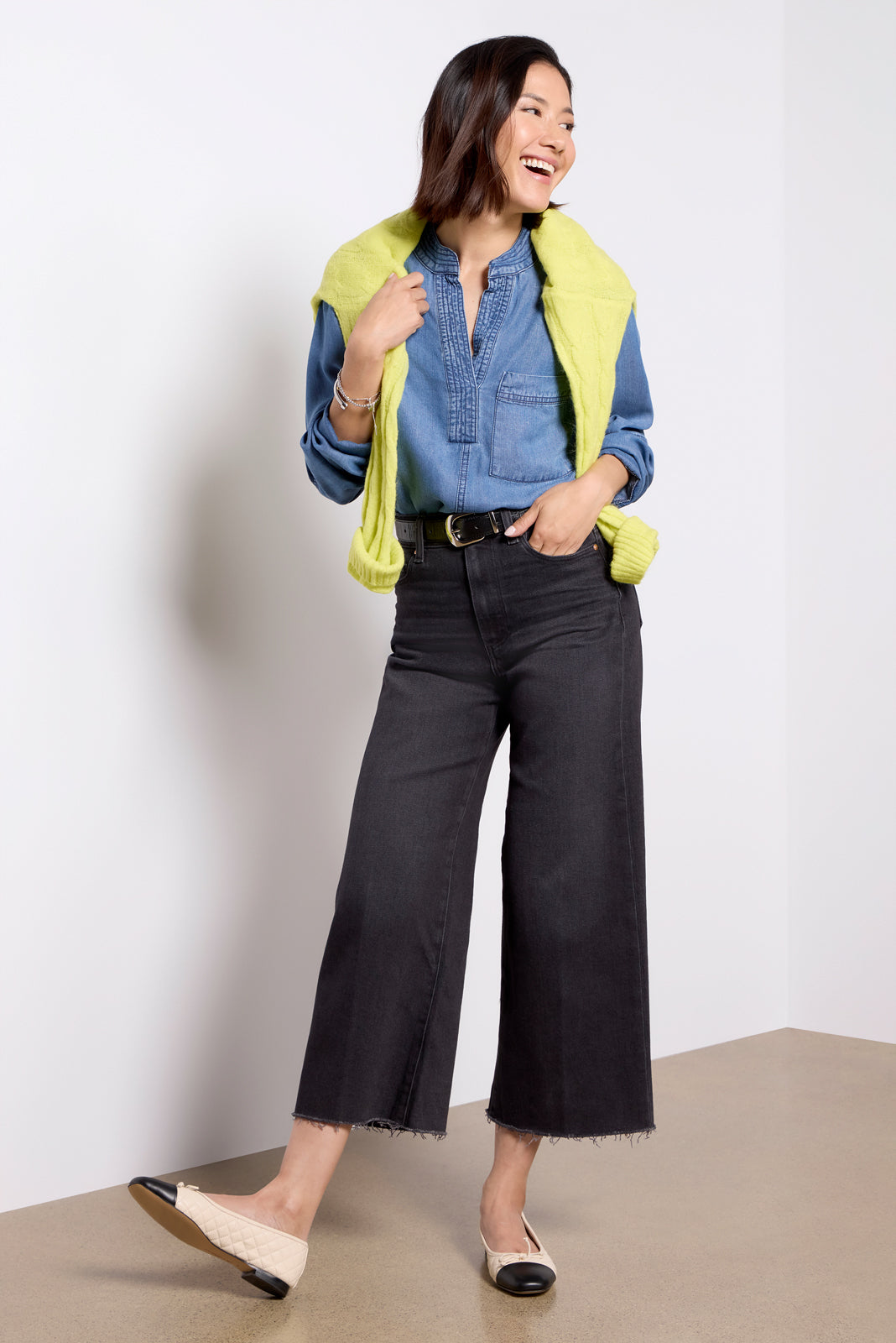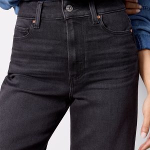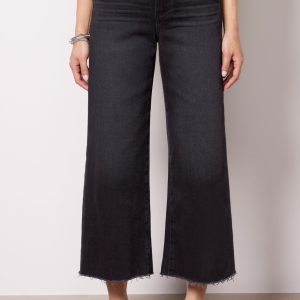 The wide leg jean you’ll be wearing on repeat. Designed with a petite 25″ inseam and higher knee and mid-thigh placements, these Paige jeans are crafted in soft stretch denim with a flattering high-rise fit,black wash, and ankle-length raw hems.