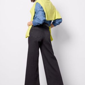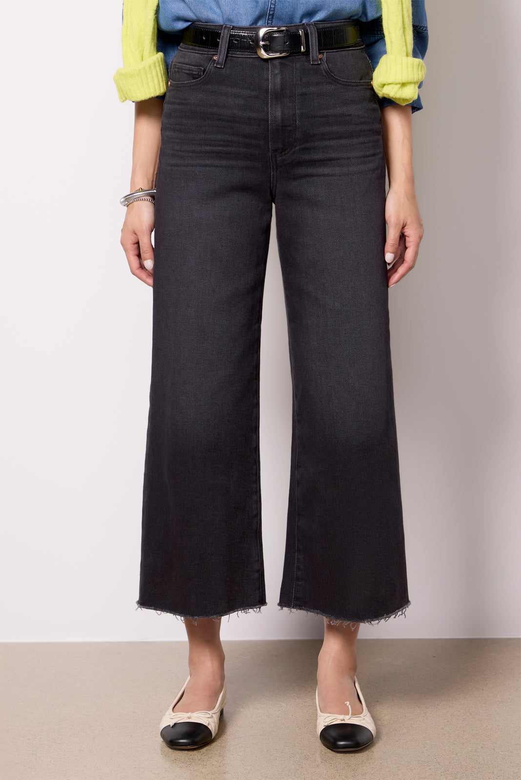 The wide leg jean you’ll be wearing on repeat. Designed with a petite 25″ inseam and higher knee and mid-thigh placements, these Paige jeans are crafted in soft stretch denim with a flattering high-rise fit,black wash, and ankle-length raw hems.