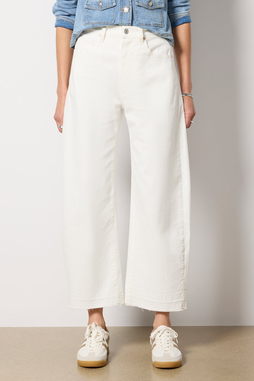 Released hems add a lived-in feel to the Arellia barrel leg jean by Paige, crafted in softecru denim with a high-rise fit and ankle-length inseam.