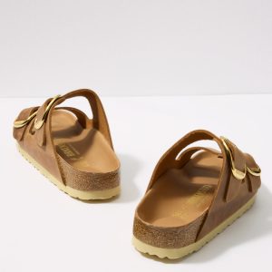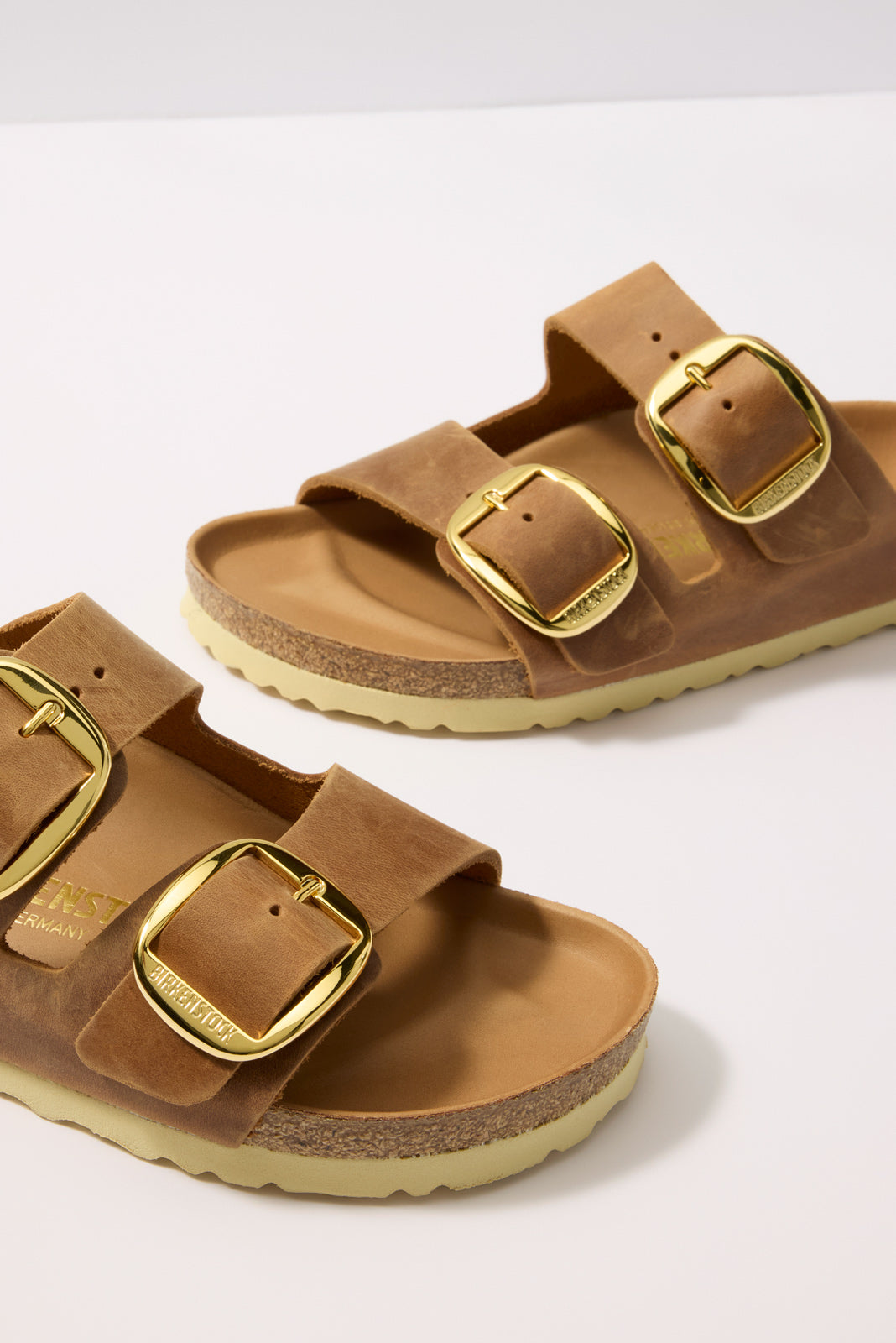Bold gold-tone buckles update these iconic Arizona sandals by Birkenstock, featuringleather straps and a comfortable cork footbed.
