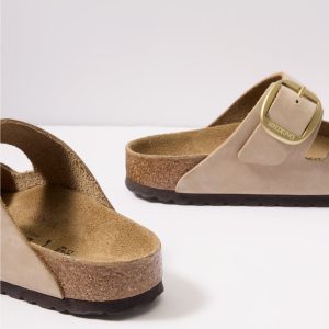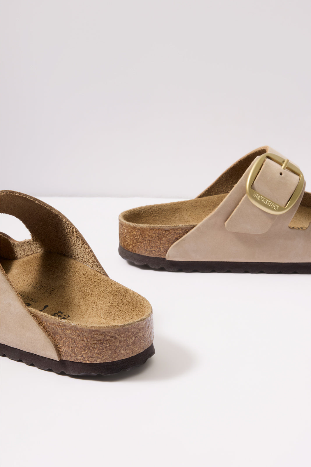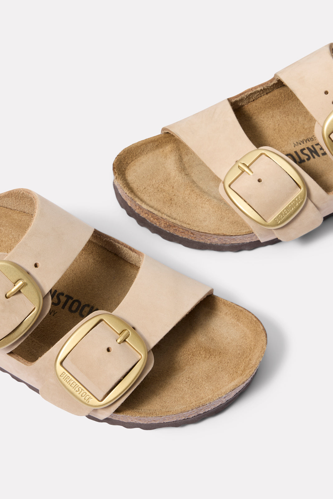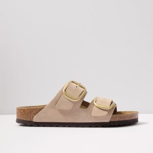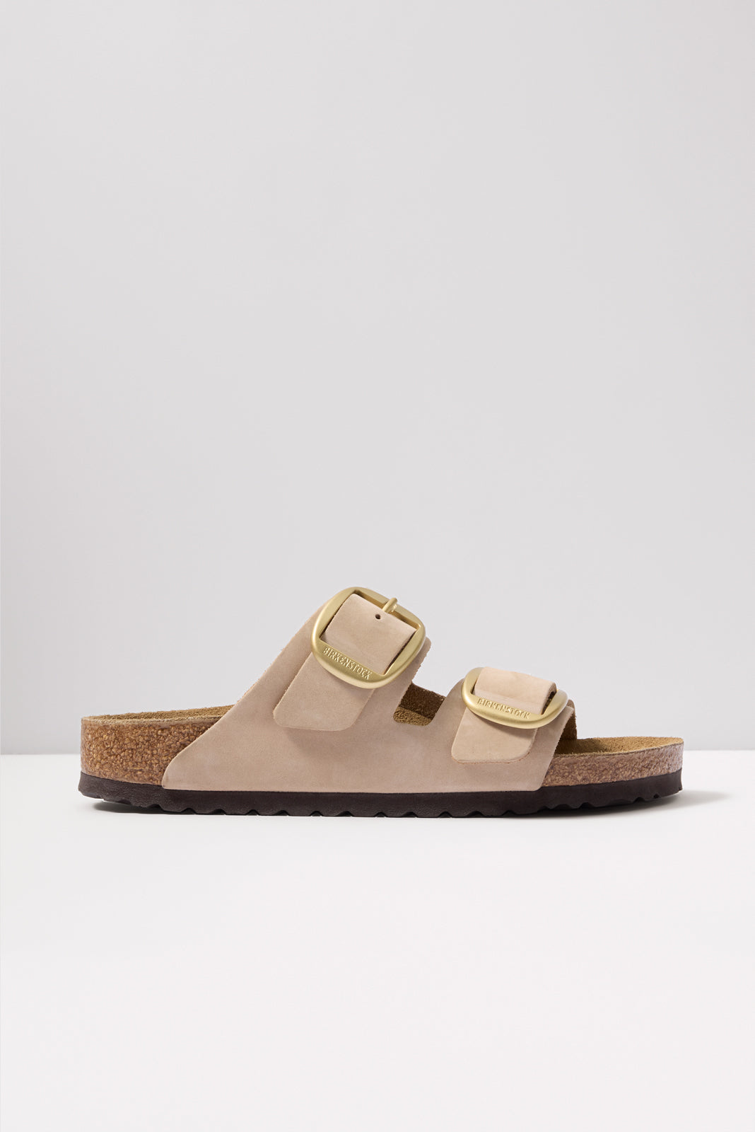 Bold gold-tone buckles update these iconic Arizona sandals by Birkenstock, featuringnubuck leather straps and a comfortable cork footbed.