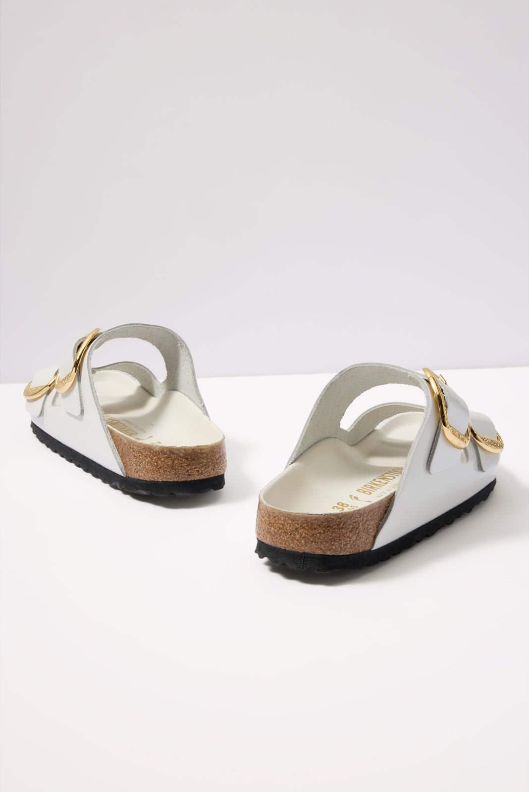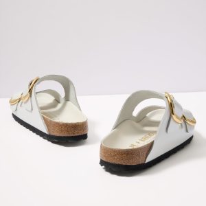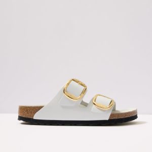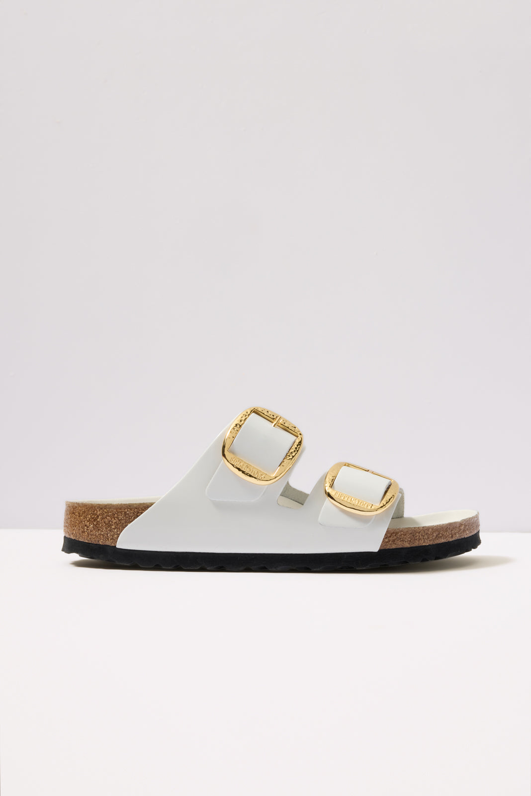 Hammeredgold-tone buckles update these iconic Arizona sandals by Birkenstock, featuringwhite leather straps in a shiny patent finish.