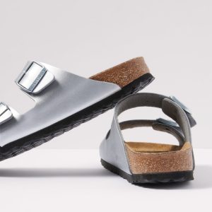 Silver metallic leather gives an eye-catching update to these iconic Birkenstock sandals, featuring an adjustable two-strap design and a comfy cork footbed.