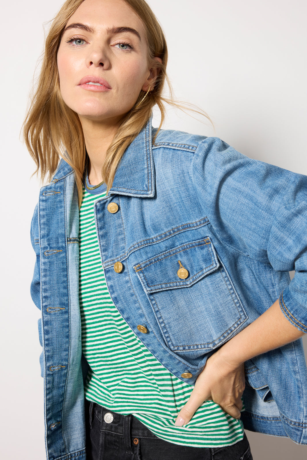Layer any day-to-night look with the Arya denim jacket by KUT From The Kloth, finished in a soft cotton blend with a relaxed fit, front button closures, and a single chest pocket.