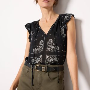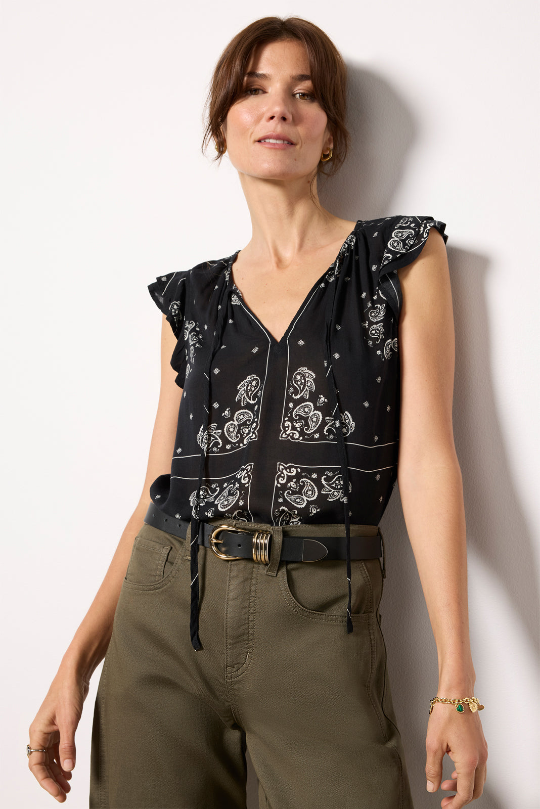 Elevate your day-to-night wardrobe with the Bandana Print Tank by Cloth& Stone, crafted from lightweight woven fabric with ruffled shoulders, a curved hem, and a v-neckline with tie details.