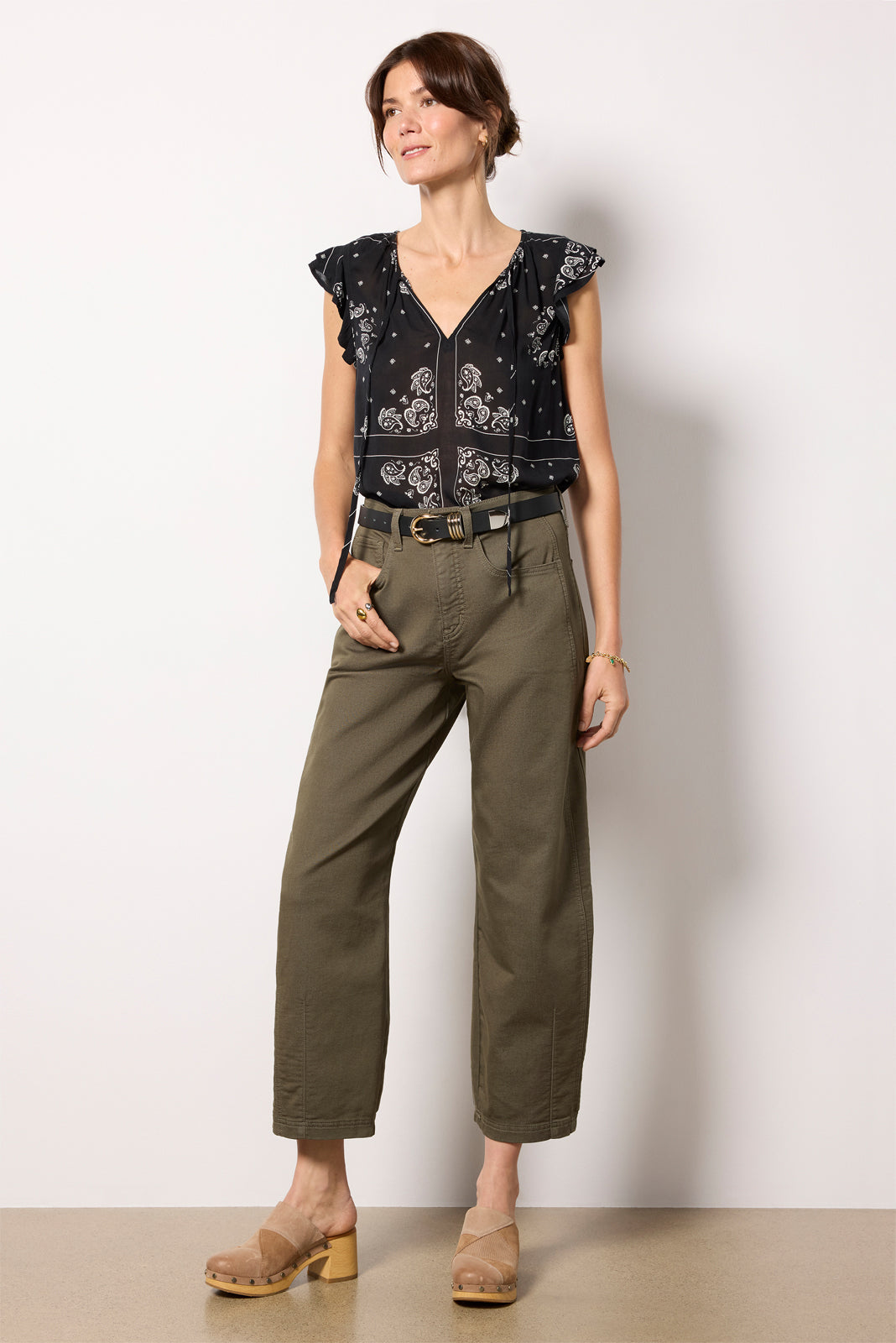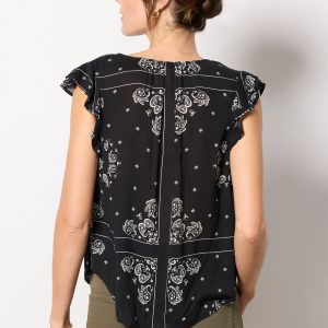 Elevate your day-to-night wardrobe with the Bandana Print Tank by Cloth& Stone, crafted from lightweight woven fabric with ruffled shoulders, a curved hem, and a v-neckline with tie details.