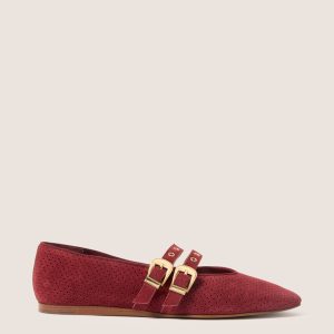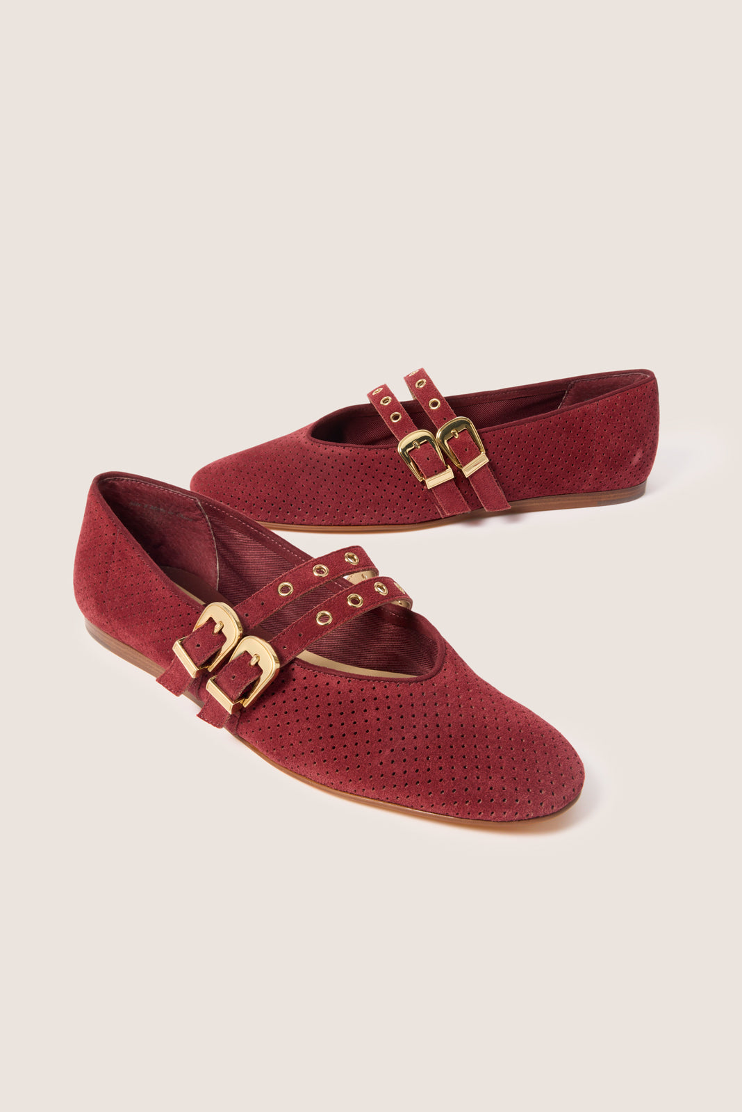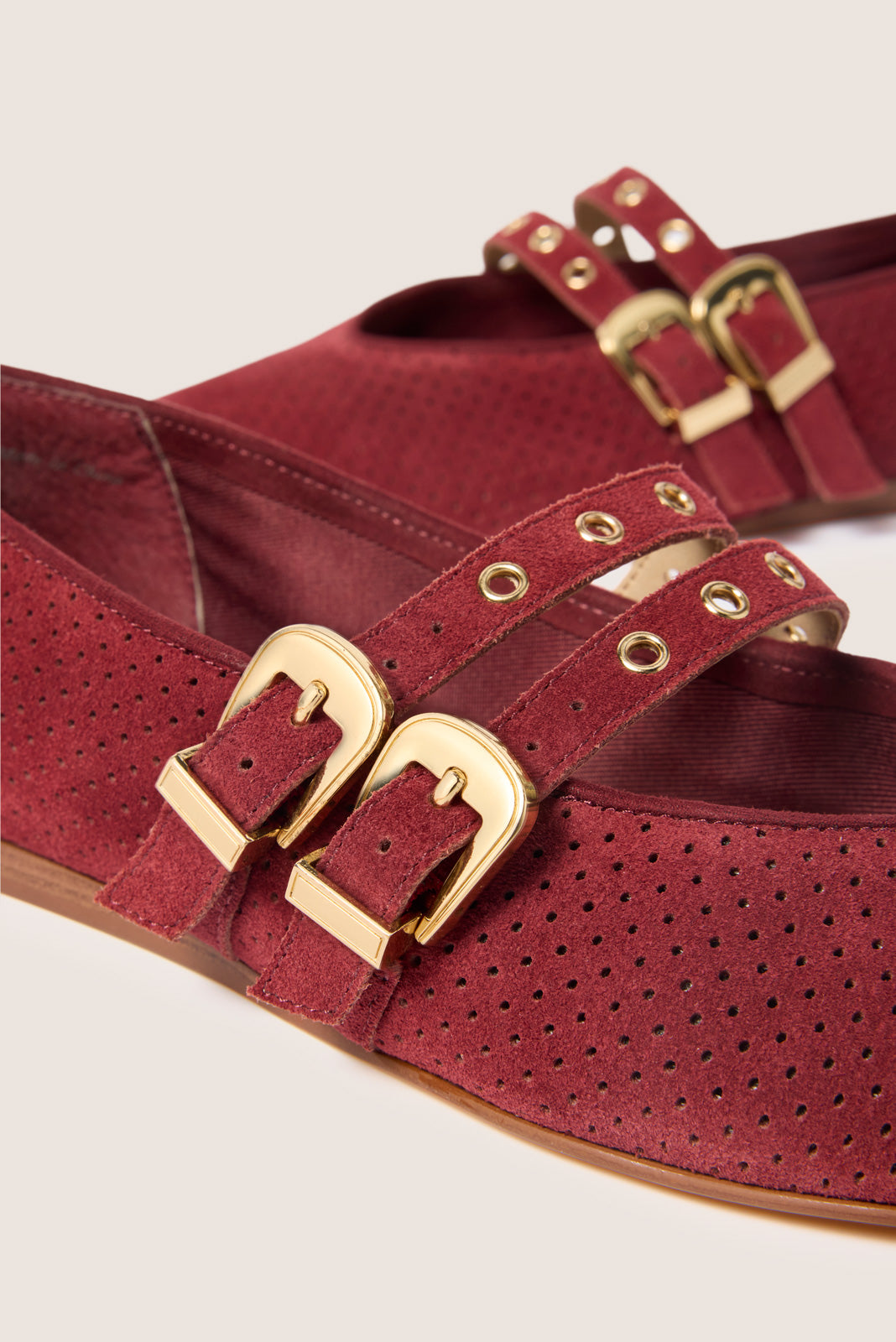 A chic pick for work-to-weekend wear, the Baylee Mary Jane flat by Dolce Vita features a perforated suede upper, round toe, and adjustable buckle straps withgold grommet details.