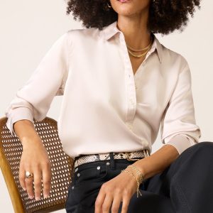 Finished in silky smooth fabric with a beautiful drape, this Spanx button-down shirt will take you from office to evening with ease. The Better Than Silk Top features a relaxed silhouette with a curved hemline, front button closures, and long sleeves.