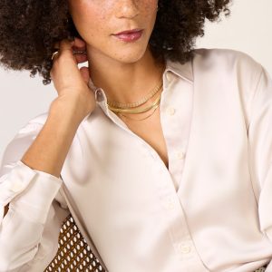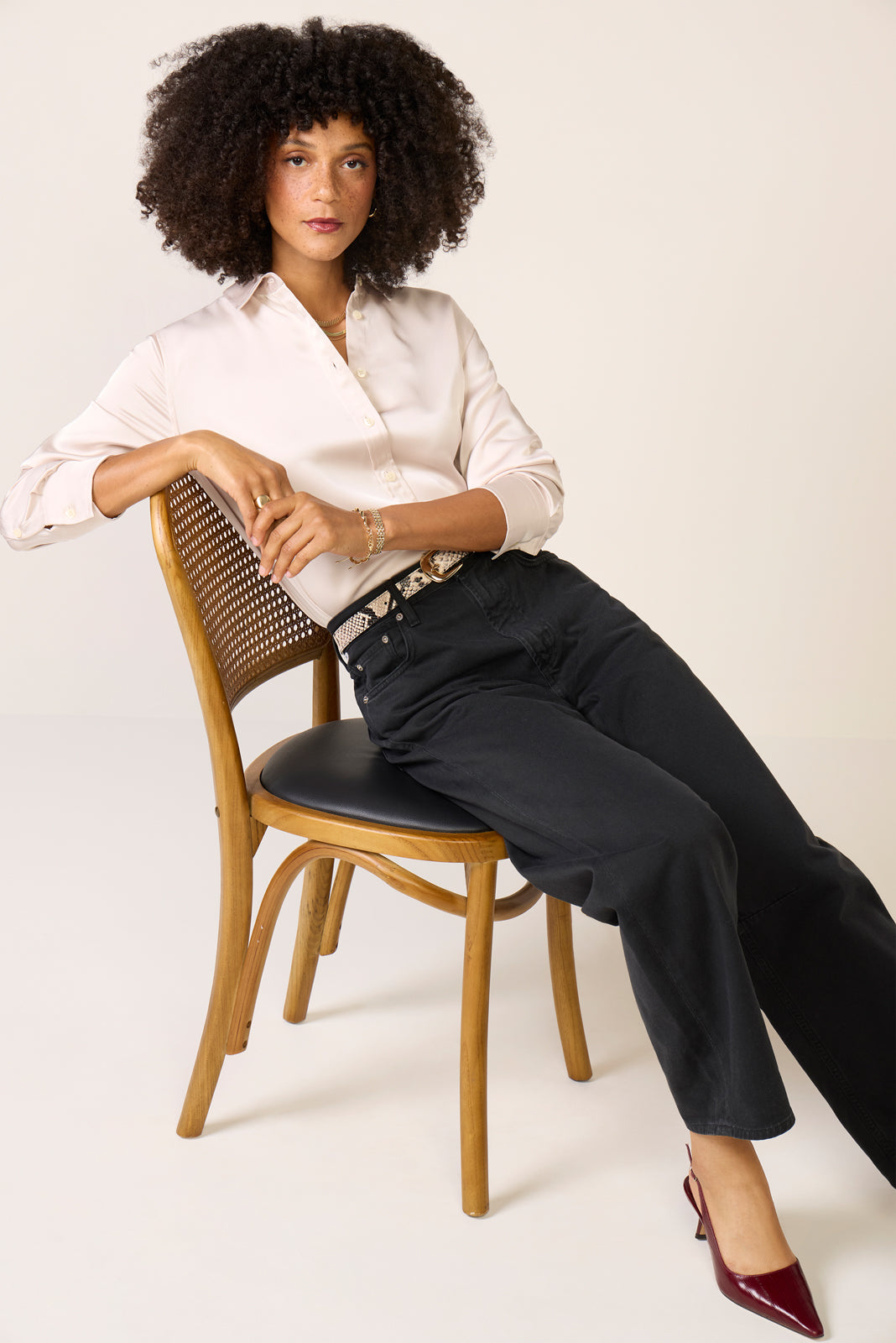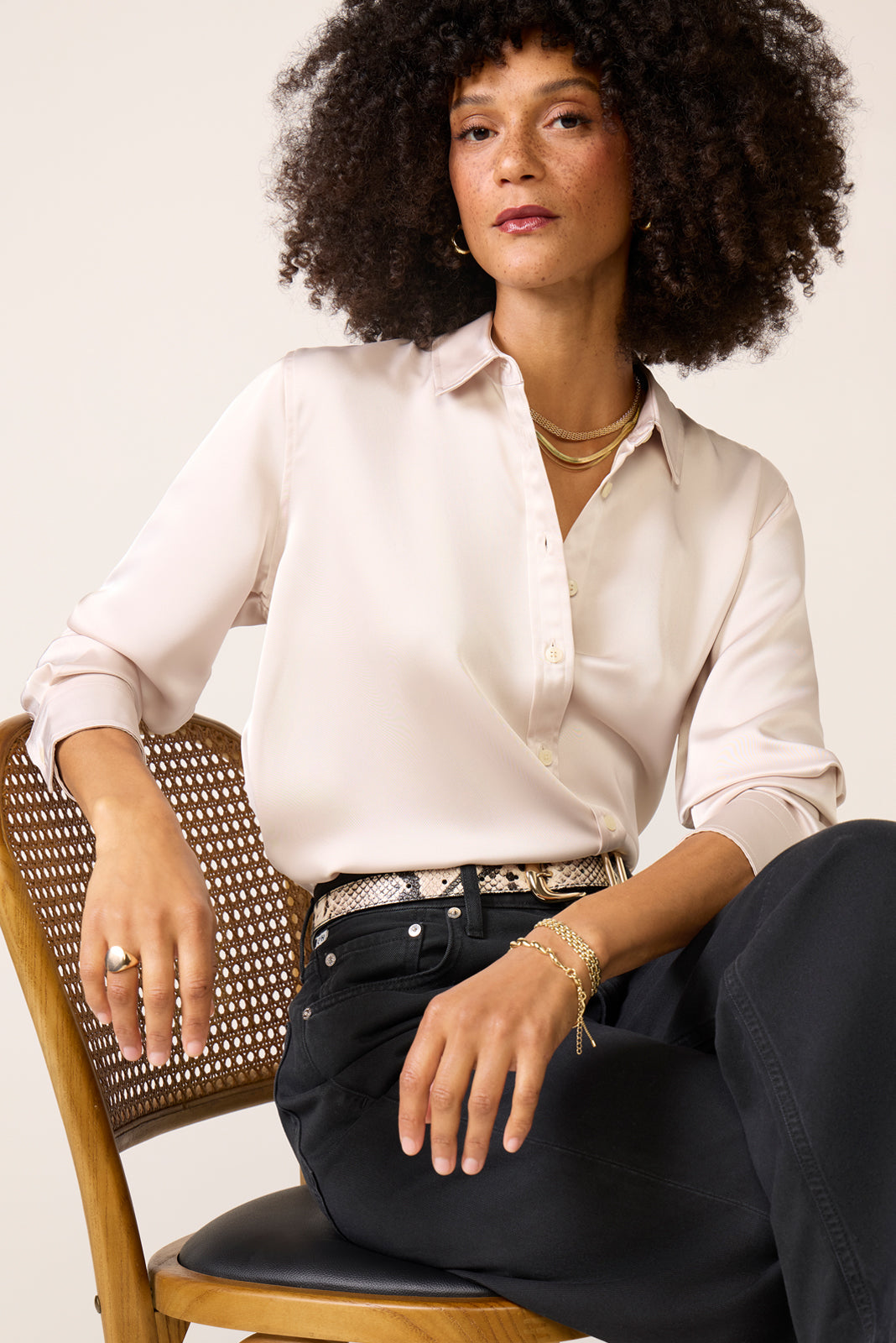 Finished in silky smooth fabric with a beautiful drape, this Spanx button-down shirt will take you from office to evening with ease. The Better Than Silk Top features a relaxed silhouette with a curved hemline, front button closures, and long sleeves.