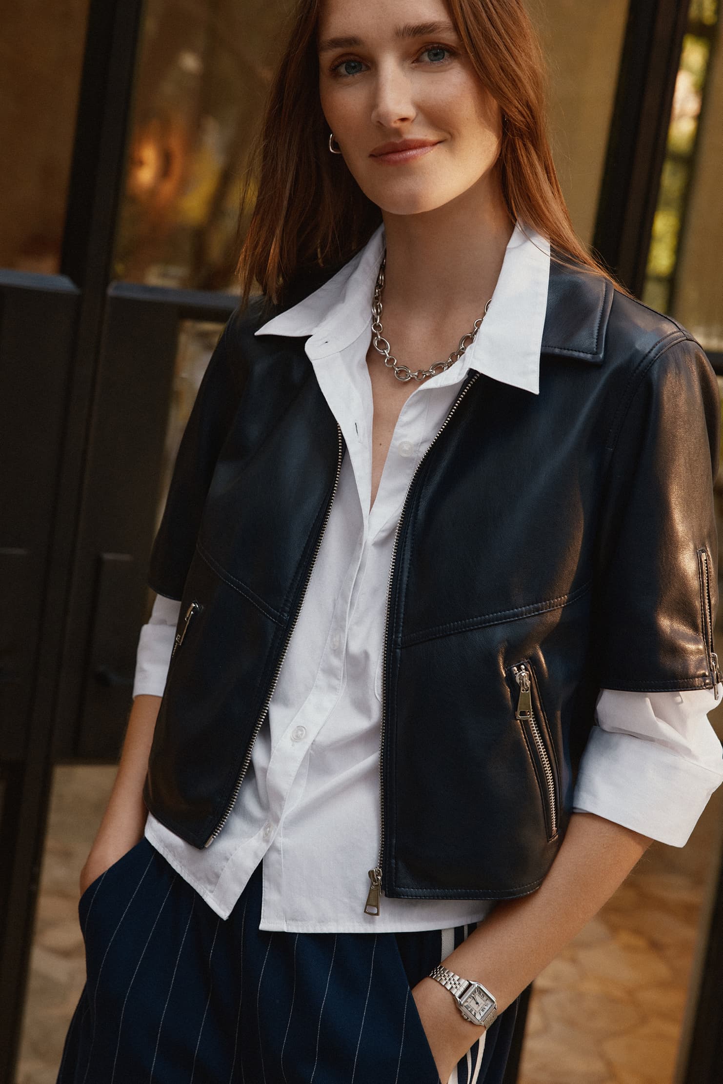 The perfect addition to your transitional wardrobe, the Billie Moto by EVEREVE features a classic collar, short sleeves with zipper detailing, and a slightly cropped silhouette.