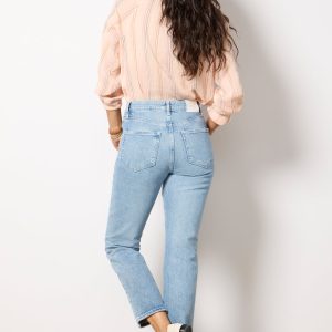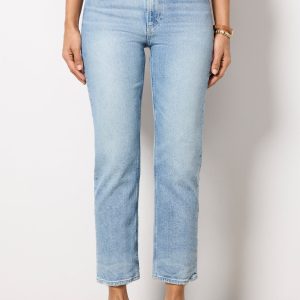 Crafted in soft stretch denim, the Billy Crop Jean by Paige features a high-rise waist, light blue wash, and a straight-leg silhouette.