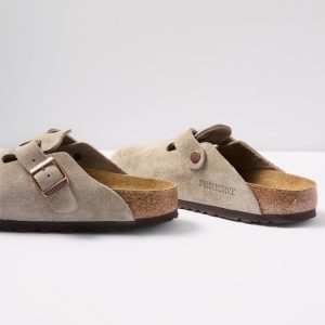 These iconic Birkenstock clogs are an easy, effortless favorite, featuring softtaupesuede, a comfy cork footbed, and an adjustable buckle for the perfect fit.
