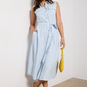 Crafted in breezy linen, thisstriped shirt dress by KUTfrom the Kloth features a midi silhouette with a point collar, front button closures, and a fabric self-tie belt to define the waist.