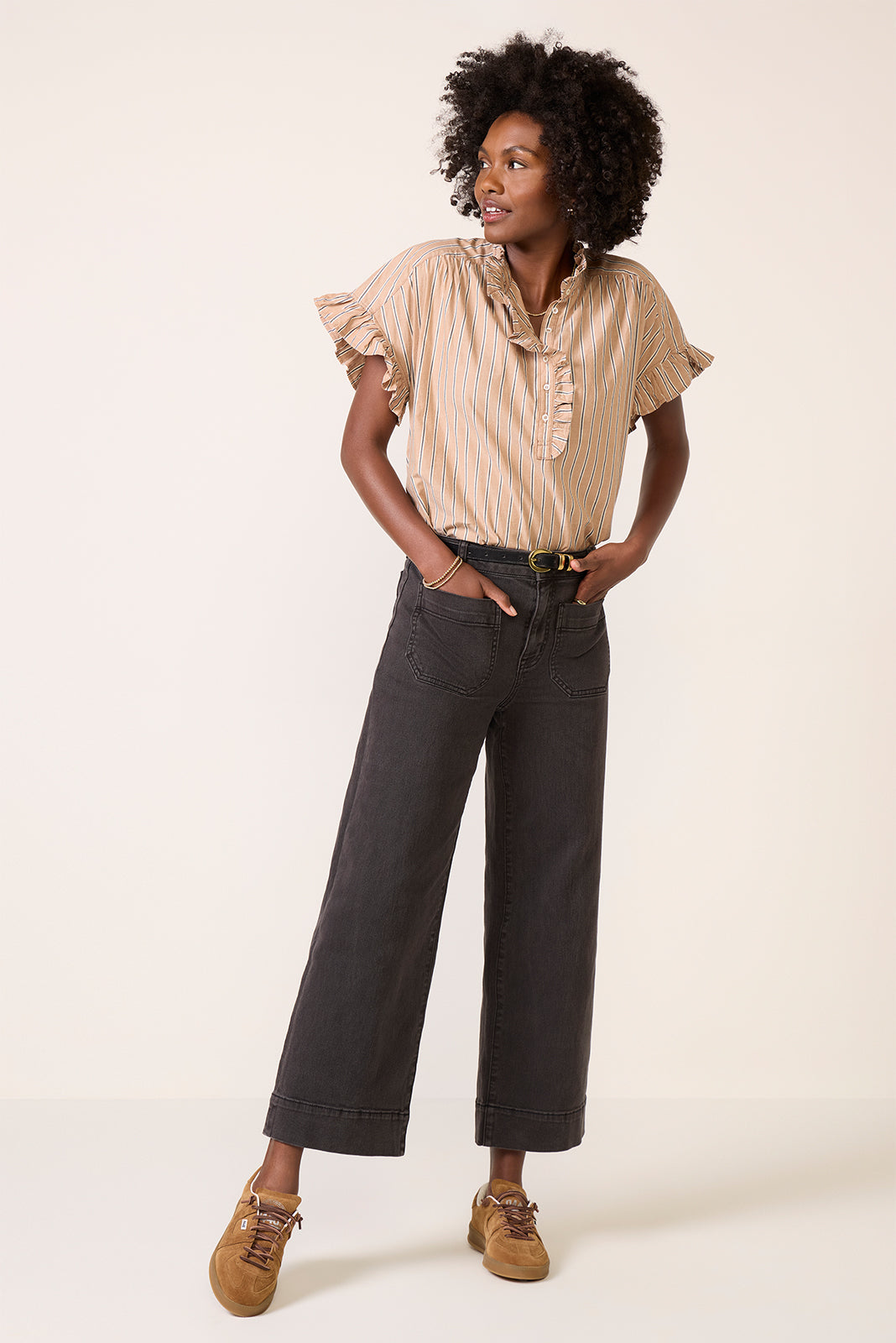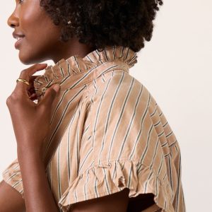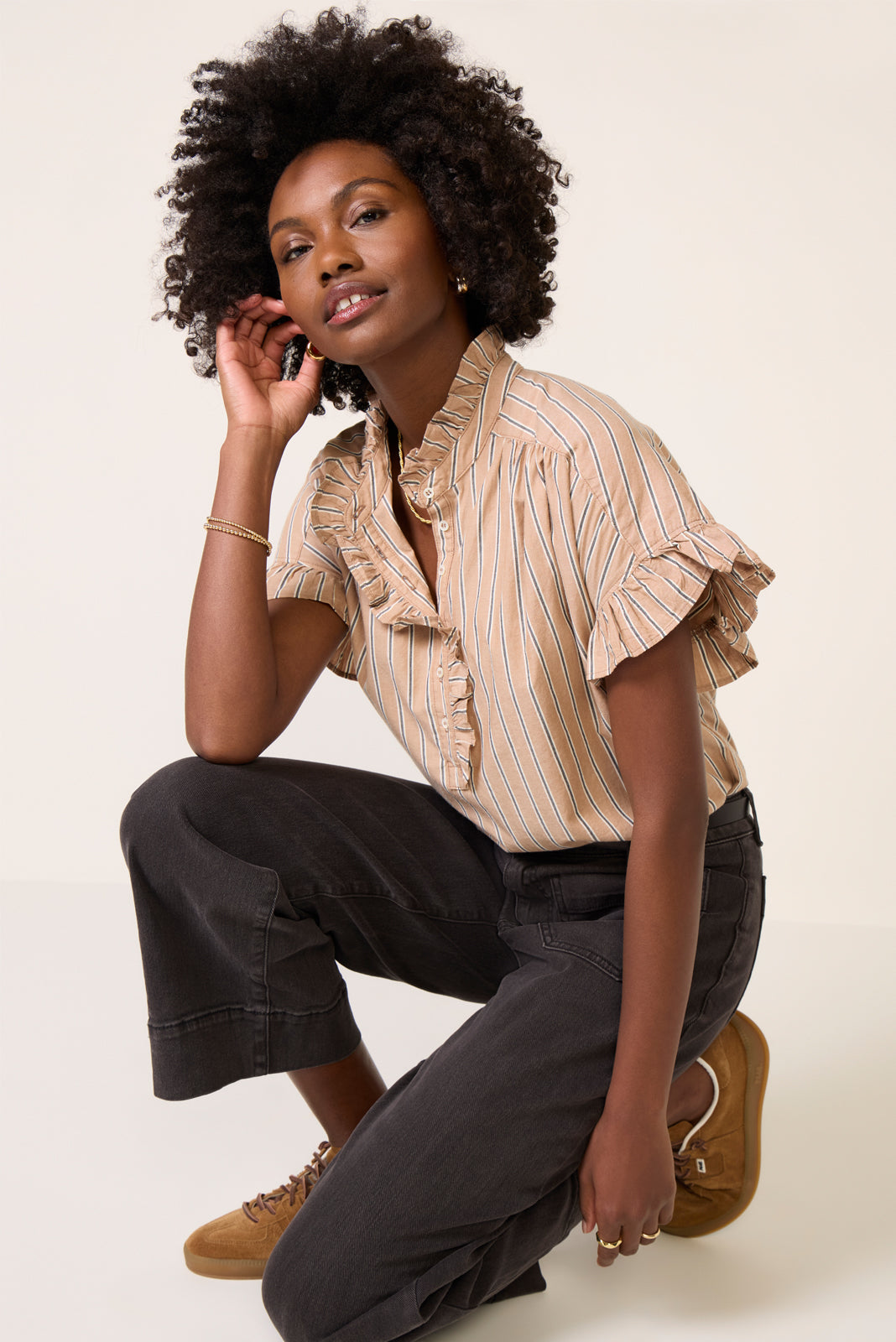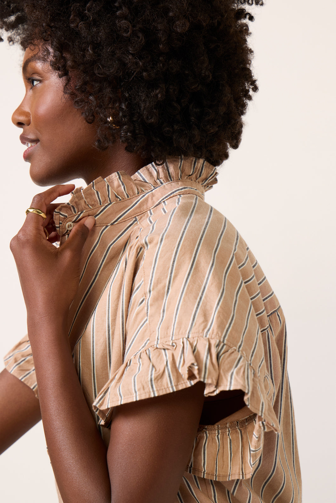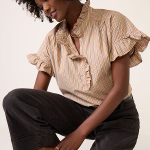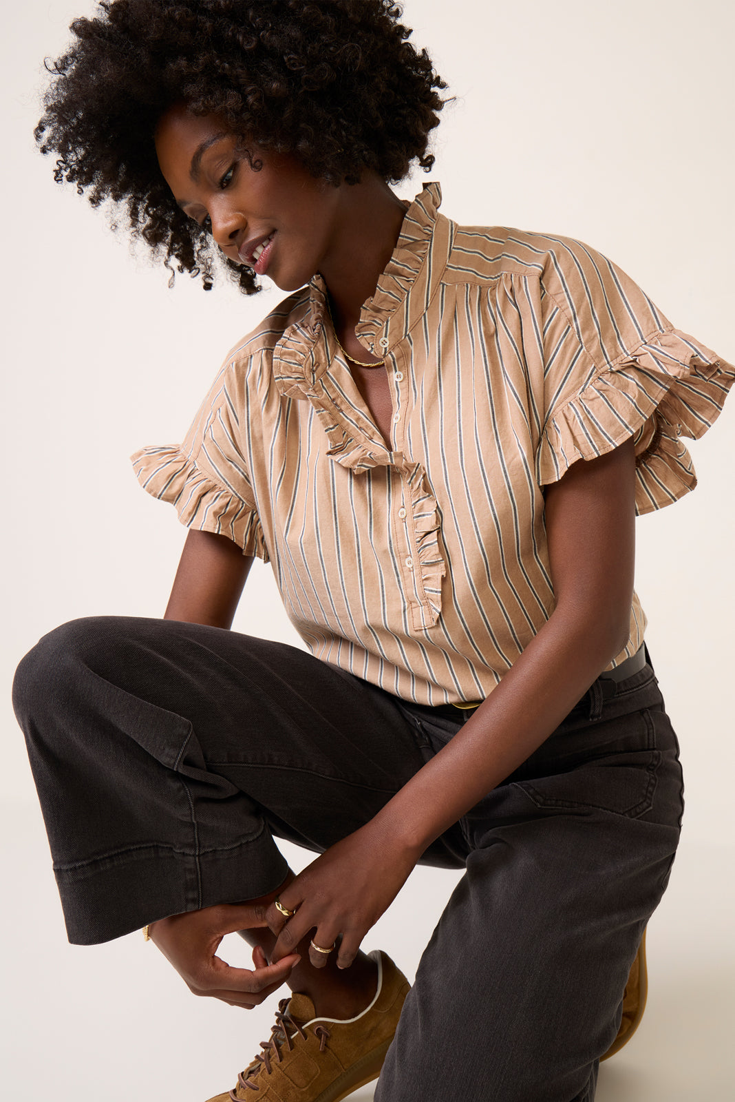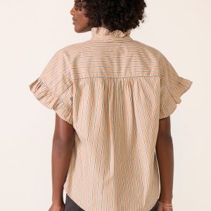 Feminine ruffles adorn the Brie stripedshirt by Xirena,featuring a relaxed silhouette, cotton fabric, and half button placket.