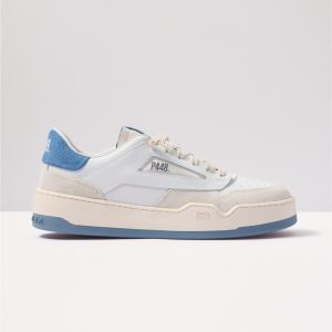 A blue sole adds the perfect detail to these versatile sneakers from P448 featuring a denim textured heel tab, a white and cream upper, and a rubber sole.