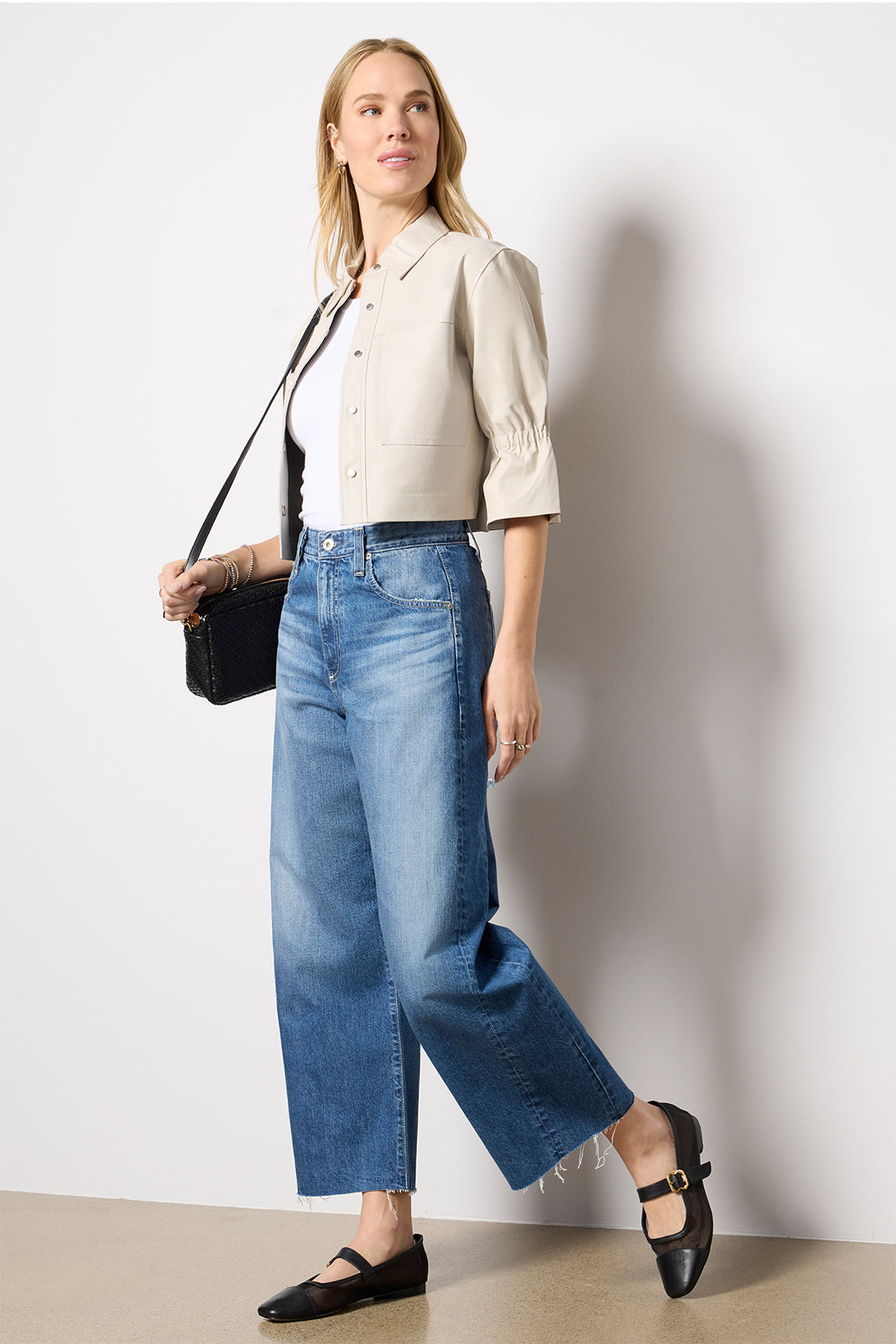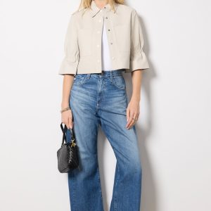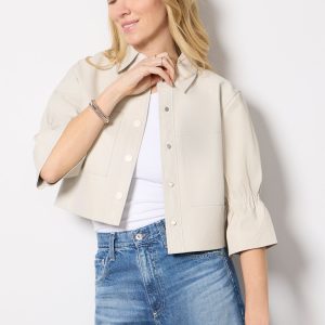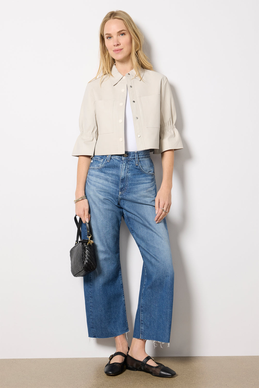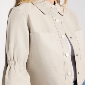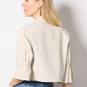 Add a fun and feminine twist to your layering collection with the Carolina Jacket from Lamarque. This leather jacket featuresa cropped length, front snap closures, and ruffledshort sleeves