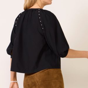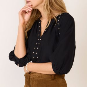 Crafted in a soft cotton blend, the Celina Blouse by EVEREVE features a split v-neckline, dolman sleeves, stud details, and a relaxed silhouette.
