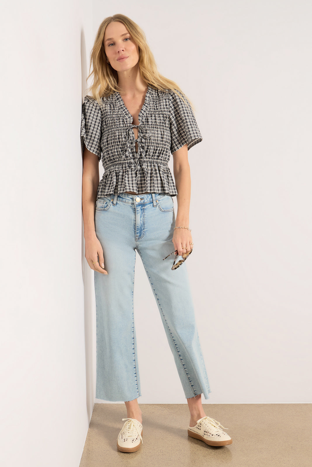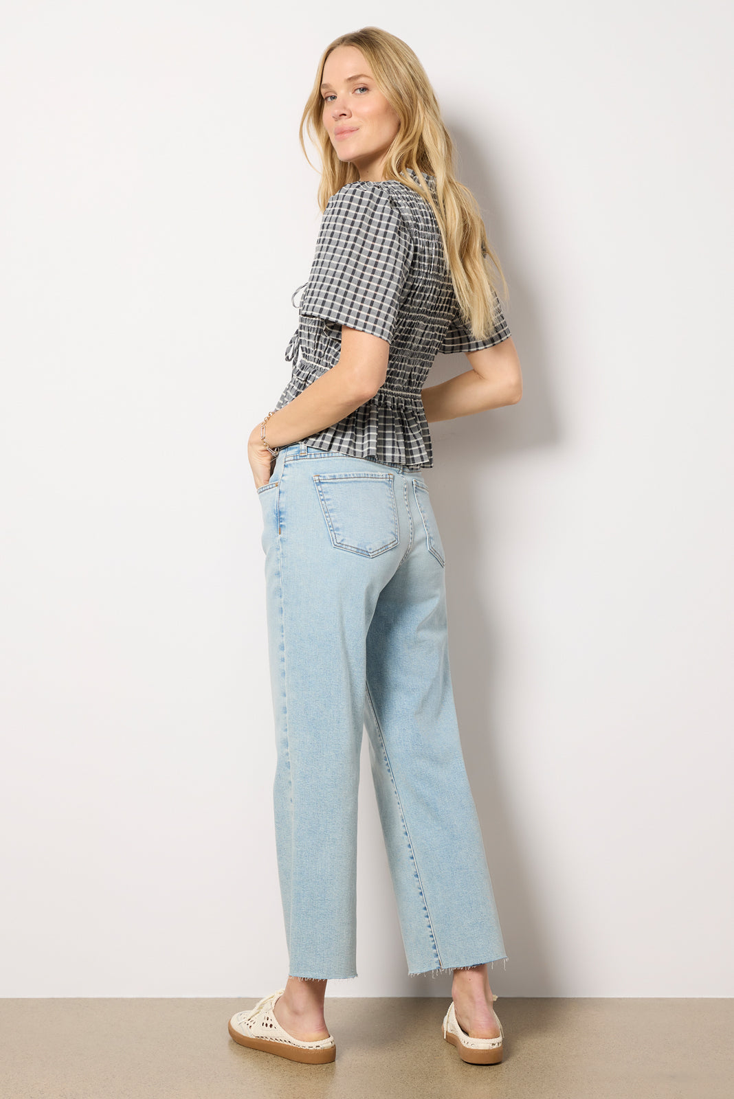 A relaxed fit defines the Charlottejean by KUT From The Kloth, crafted in light-wash denim with a mid-rise waist and ankle-length raw hems.