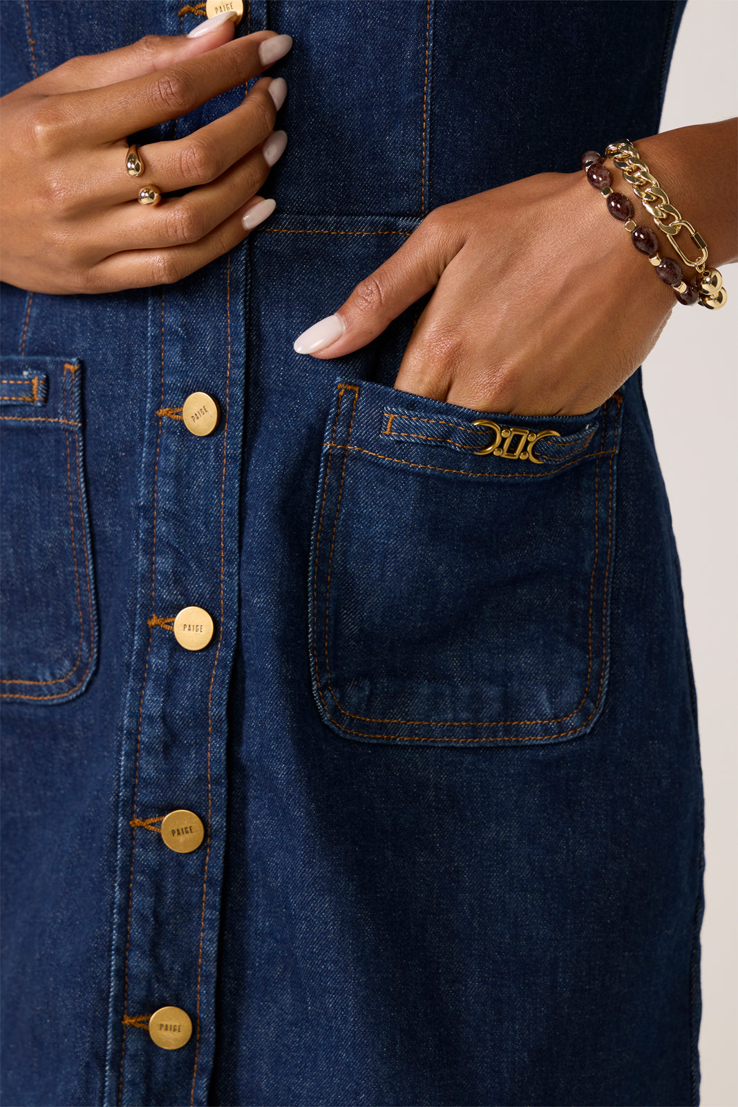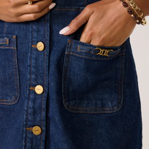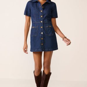 Refresh your fall denim collection with the Clementine Dress by Paige. Finished in a dark blue wash, this denim mini dressis crafted from soft organic cotton-blendstretch denim and features a defined waist, front button closures, and patch pockets with gold hardware details.