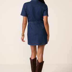 Refresh your fall denim collection with the Clementine Dress by Paige. Finished in a dark blue wash, this denim mini dressis crafted from soft organic cotton-blendstretch denim and features a defined waist, front button closures, and patch pockets with gold hardware details.