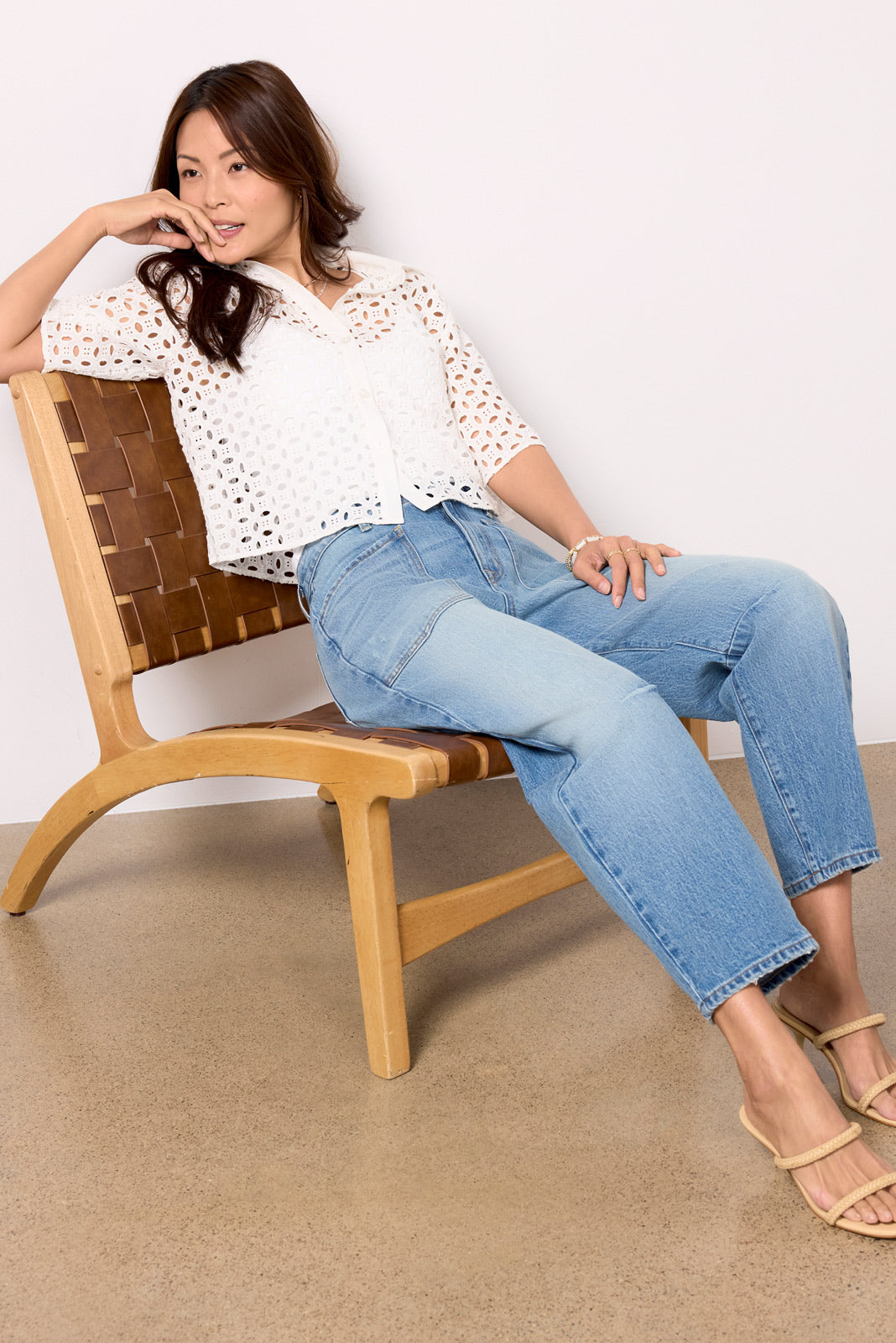 Utility pocketselevate the effortlessly cool Corabarrel jean by EVEREVE. Finished in cotton-blend denim with a hint of distressing,these high-rise jeans feature a cropped inseam and curved leg with darting details at the knee.