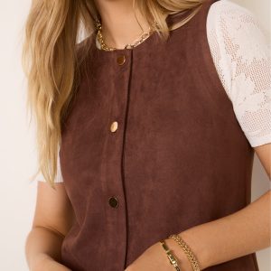Flattering and oh-so-chic, the Darcyfaux suede dress by EVEREVE features a mini silhouette with a crew neckline, gold button details, andfront pockets.
