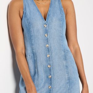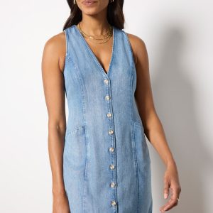 Refresh your warm-weather collection with this denim mini dress by Cloth & Stone. Finished in soft lyocell denim, this button-front dress features a relaxed, sleeveless silhouette with front pockets, vertical seaming, and an adjustablestrap at back to cinch the waist.