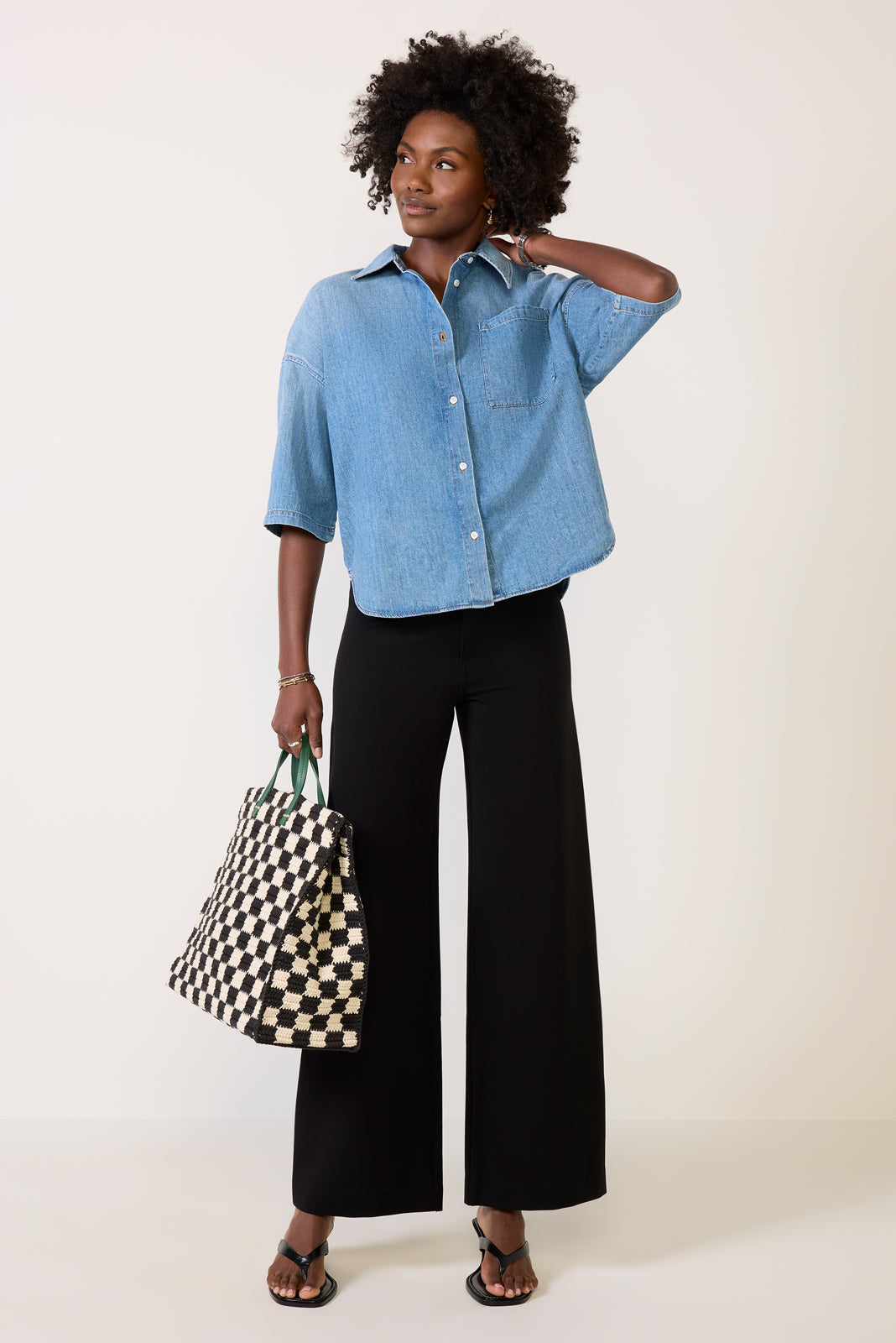 Made to move with you from workday to date night, these wide leg pants by Z Supply are crafted from midweight stretch ponte fabric and feature a high-rise fit, full-length inseam, and back patch pockets.