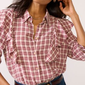 Add a hint of Western to your blouse collection with the Dru Ruffle Front Shirt by LNA, featuring a plaid print, point collar, front button closures, and a relaxed silhouette.