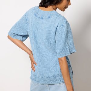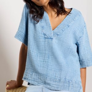 An easy-breezy staple for warm-weather wear, this popover top by Faherty is crafted in organic cotton gauze and features a side split hem, elbow-length short sleeves, and a relaxed fit that can be dressed up or down.