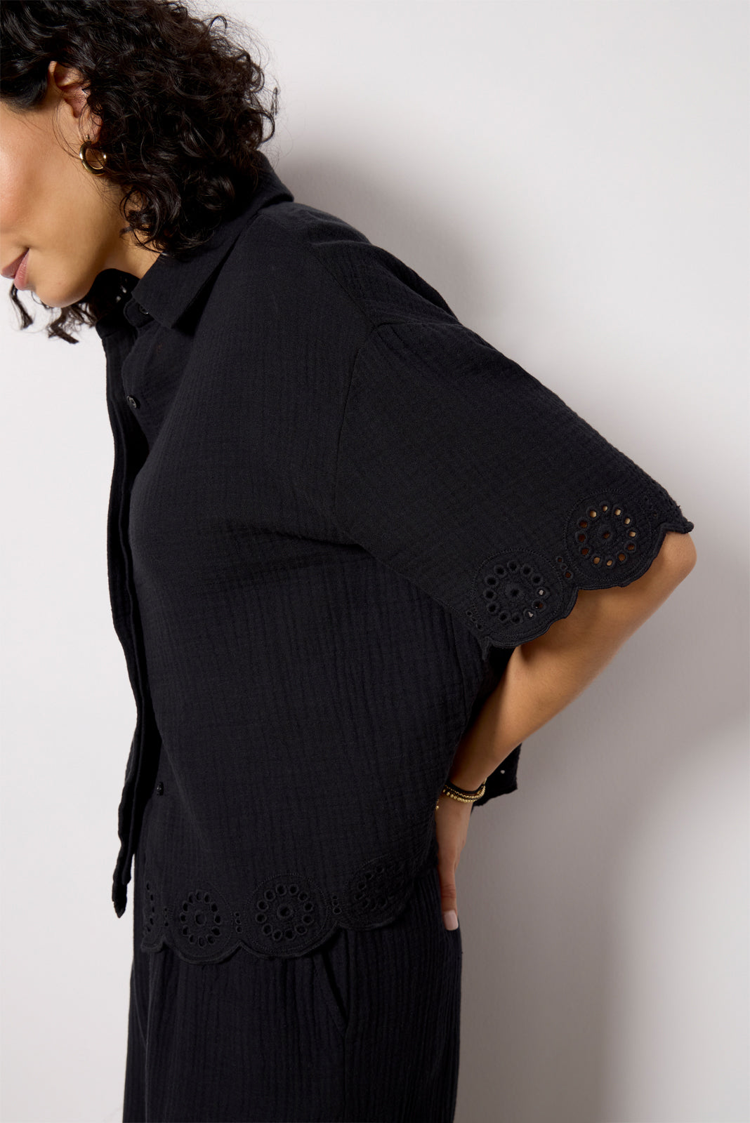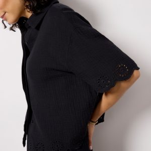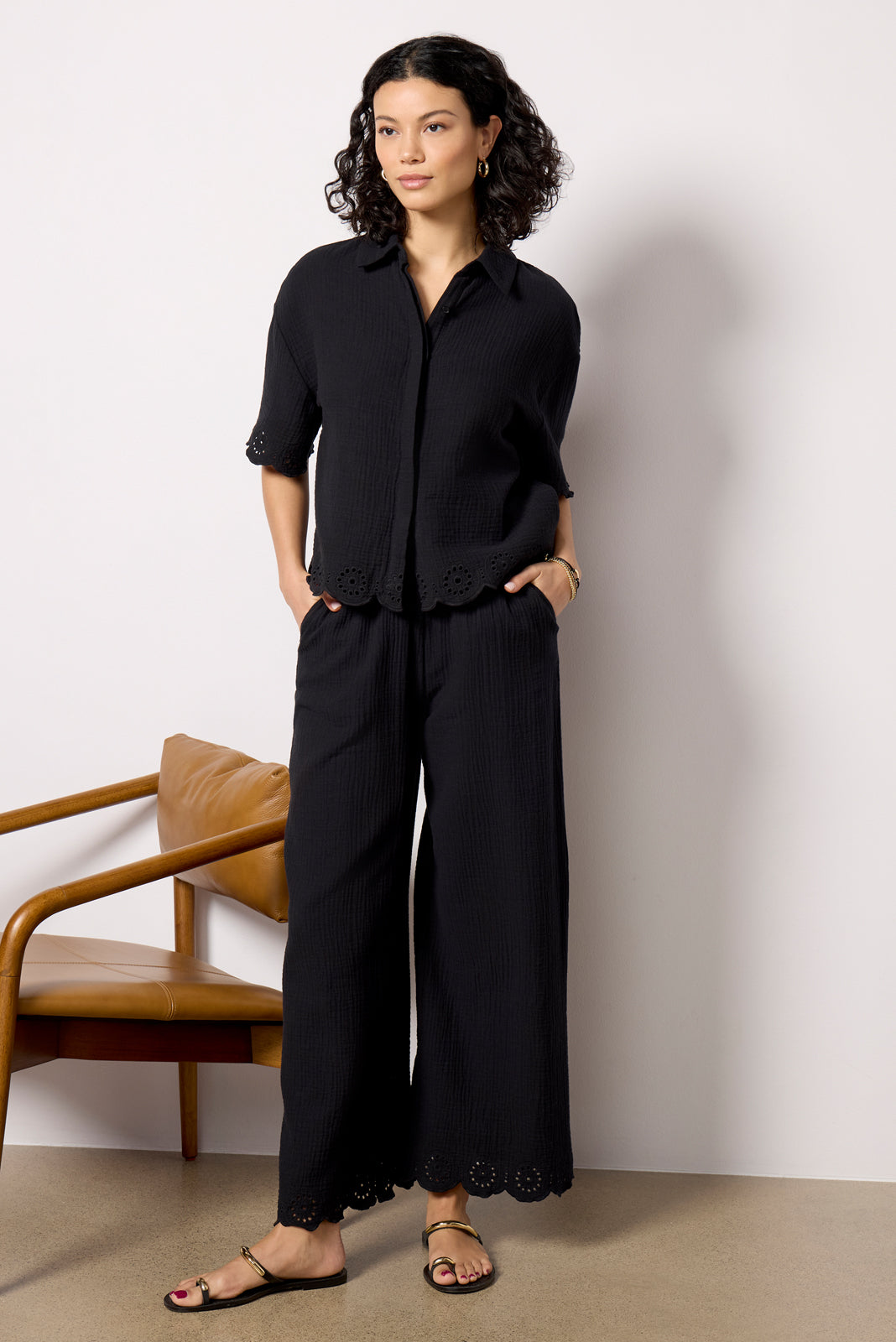 Perfect for warm-weather wear, the Eden button-down top by Design History is crafted in breezy cotton gauze and features a relaxed fit, hidden button placket, and scalloped eyelet trim. Pair with the matching Eden Gauze Eyelet Pant for a chic two-piece set.